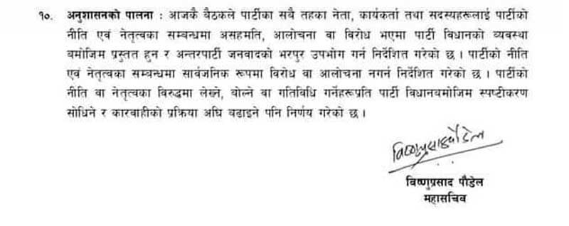 महासचिव विष्णु पौडेलद्वाराज जारी विज्ञप्तिको बुँदा नं. १० मा भनिएको छ, ‘अनुशासनको पालनाः आजकै बैठकले पार्टीका सबै तहका नेता, कार्यकर्ता तथा सदस्यहरूलाई पार्टीको नीति एवम् नेतृत्वका सम्बन्धमा सहमति, आलोचना वा विरोध भएमा पार्टी विधानको व्यवस्था वमोजिम प्रस्तुत हुन र अन्तरपार्टी जनवादको भरपुर उपभोग गर्न निर्देशित गरेको छ । पार्टीको नीति एवं नेतृत्वका सम्बन्धमा सार्वजनिक रुपमा विरोध वा आलोचना नगर्न निर्देशित गरेको छ । पार्टीको नीति वा नेतृत्वका विरुद्धमा लेख्ने, बोल्ने वा गतिविधि गर्नेहरूप्रति पार्टी विधान बमोजिम स्पष्टीकरण सोधिने र कारबाहीको प्रक्रिया अघि बनाइने पनि निर्णय गरिएको छ ।’
