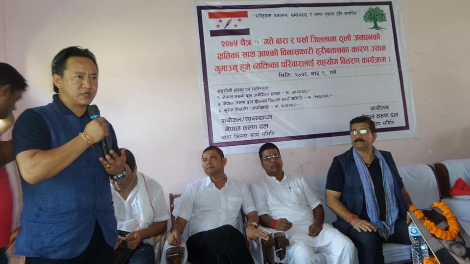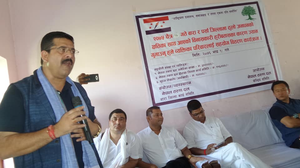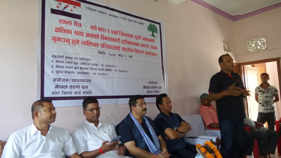 बारा र पर्साका ३१ जनाको परिवारलाई आर्थिक सहयोग प्रदान गर्न नेपाल तरुण दल अमेरिका शाखाले २ लाख आर्थिक सहयोग गरेको थियो ।