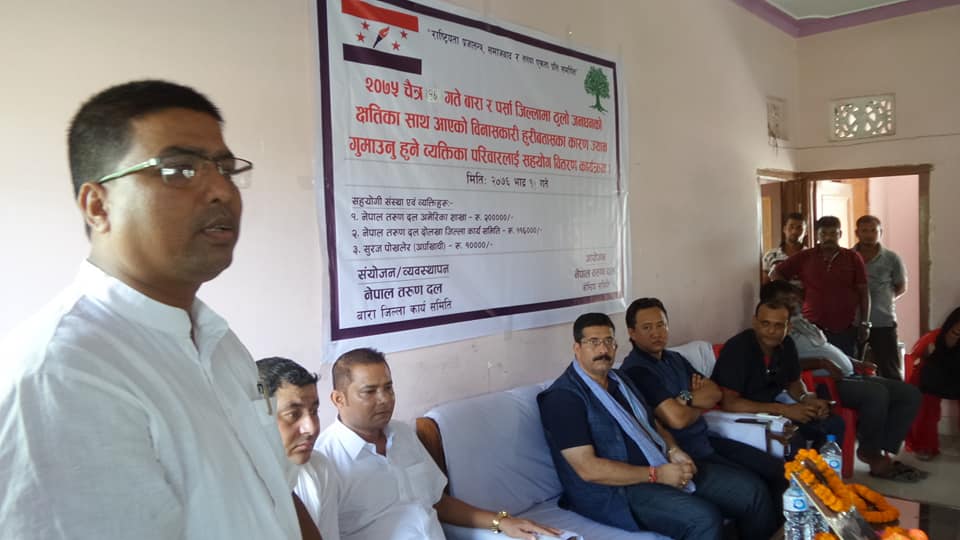 नेपाली कांग्रेस बाराको कार्यालयमा बिहीबार आयोजित कार्यक्रममा नेपाल तरुण दलका केन्द्रीय अध्यक्ष जितजंग बस्नेतले हावाहुरीबाट ज्यान गुमाएका ३१ जनाको परिवारलाई नगद सहयोग प्रदान गरेका हुन् । कार्यक्रममा नेपाली कांग्रेस बारा र पर्साका नेता तथा कार्यकर्ताहरूको पनि उपस्थिति रहेको थियो ।