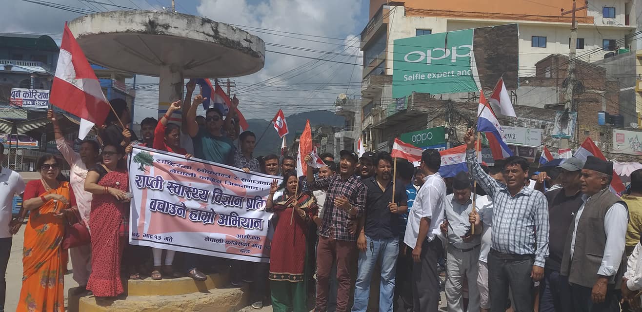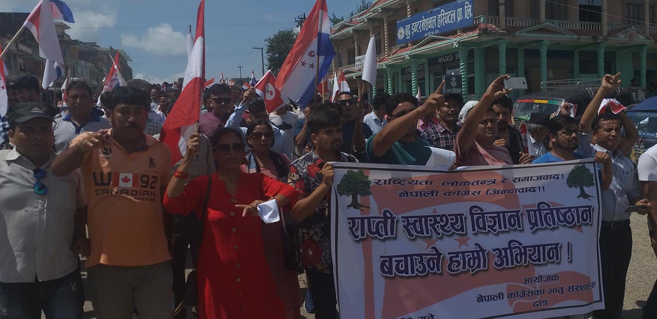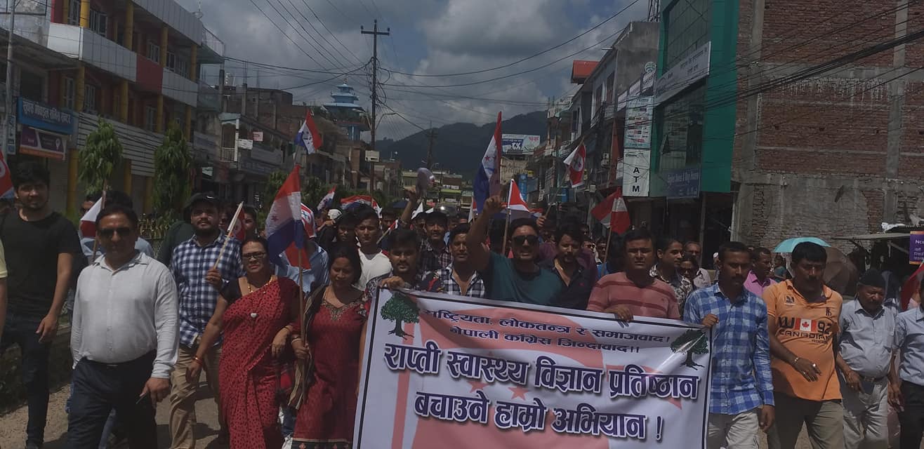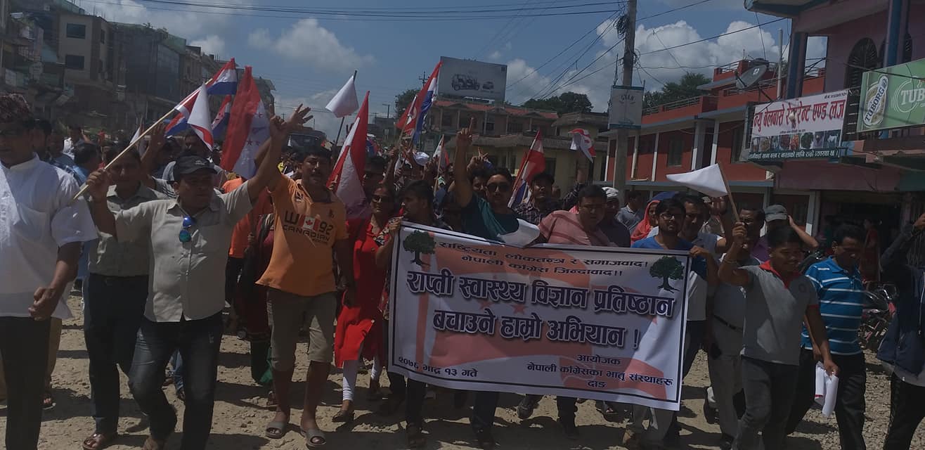 नेपाली कांग्रेस दाङका सचिव शंकर डाँगीका अनुसार नेकपाका कार्यकर्ताहरूबाट राप्ती स्वास्थ्य विज्ञान प्रतिष्ठानका कर्मचारीमाथि भएको हातपातको विरोधमा प्रदर्शन गरिएको हो ।