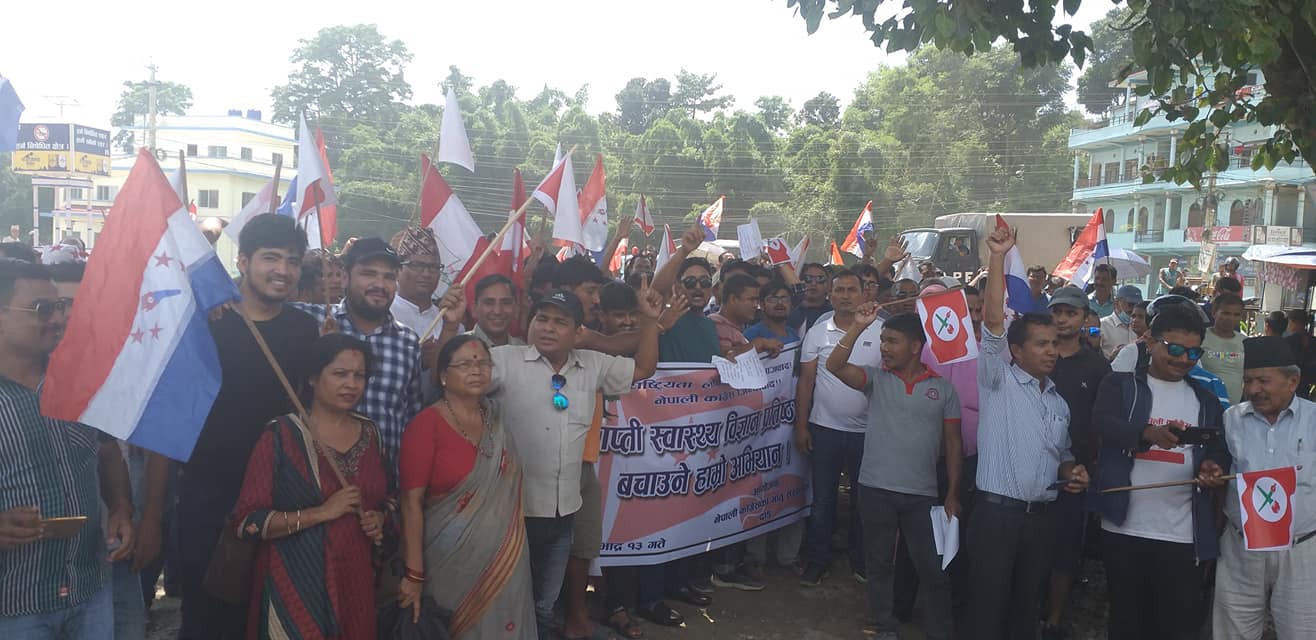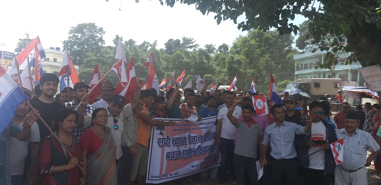 घोराही । नेपाली कांग्रेस दाङका भ्रातृ संगठनहरूले सत्तारुढ नेपाल कम्युनिस्ट पार्टी (नेकपा)का कार्यकर्ताले राप्ती स्वास्थ्य विज्ञान प्रतिष्ठानमा गरेको हर्कत र रजिष्टार रामप्रसाद प्याकुरलेलाई हातपात गरेको विरोधमा घोराहीमा सडक प्रदर्शन गरेका छन् ।