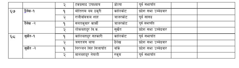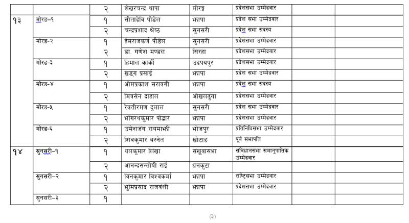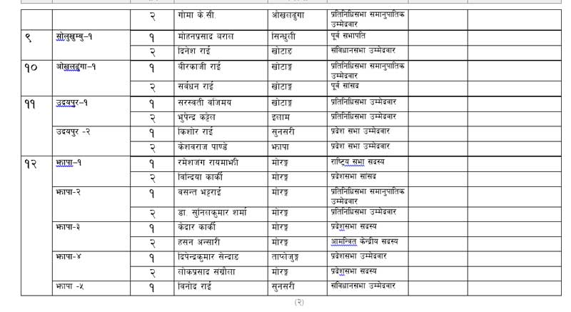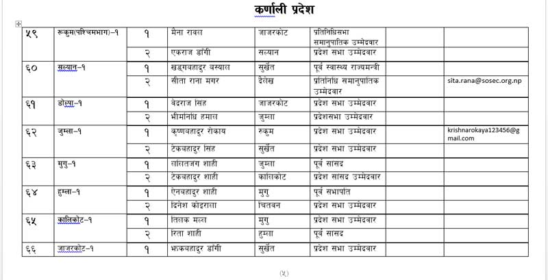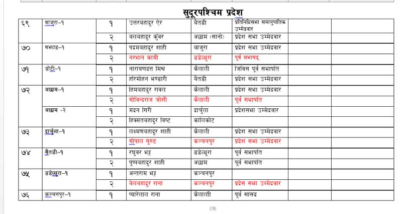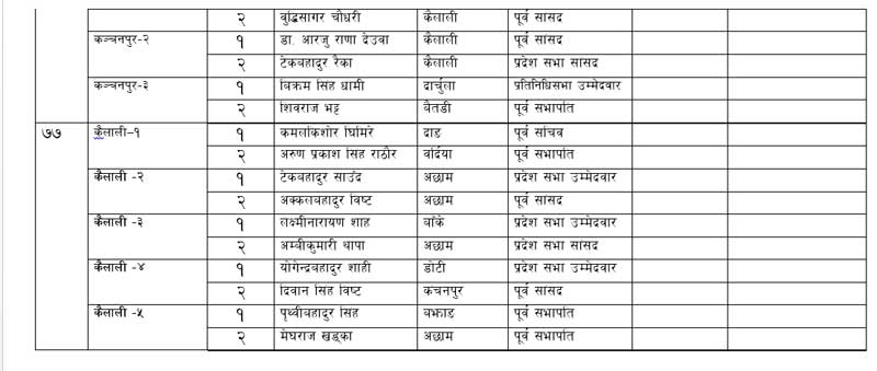 बाँकी जिल्लाहरूको प्रतिनिधिहरू क्रमशः सार्वजनिक गरिनेछ । नेपाली कांग्रेसले पहिलो चरणको प्रतिनिधिहरूको सूची सार्वजनिक गरेको जनाएको छ ।