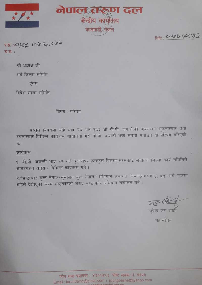 महासचिव शाहीद्वारा आइतबार जारी भएको परिपत्रमा भनिएको छ, ‘वीपी जयन्ती भदौ २४ गते वृक्षारोपण, फलफूल वितरण, सरसफाई लगायत जिल्ला कार्यसमितिले आवश्यक्ताअनुसार विभिन्न कार्यक्रम गर्ने ।’