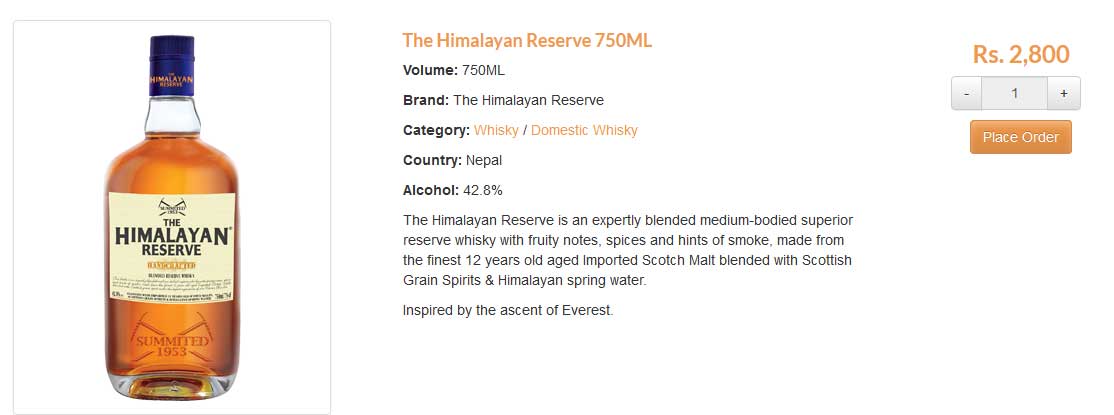 ४२.८ प्रतिशत अल्कोहल मिसिएको यो मदिरा १२ वर्ष पुरानो ब्राण्डको छ । स्कच माल्ट क्वालिटीको यो मदिराको स्प्रिट स्कटल्याण्डबाट ल्याएर हिमालको पानी मिसाएर बनाउने गरिएको वेबसाइटमा उल्लेख छ ।