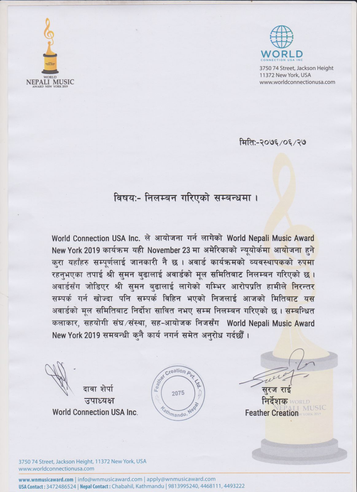 मोडल शेर्पालाई बुढाले यौन प्रस्ताव राखेको घटना बाहिर आएपछि ‘वर्ल्ड नेपाली म्युजिक अवार्ड न्युयोर्क २०१९’ अवार्ड वितरण व्यवस्थापक समितिका तर्फबाट दावा शेर्पा र सुरज राईले विज्ञप्ति जारी गरेर सुमन बुढालाई संस्थाबाट हटाएको जनाएका छन् । सुमन बुढालाई मात्रै होइन यो कार्यक्रम आयोजक सबैलाई कारबाहीको माग उठेको छ ।