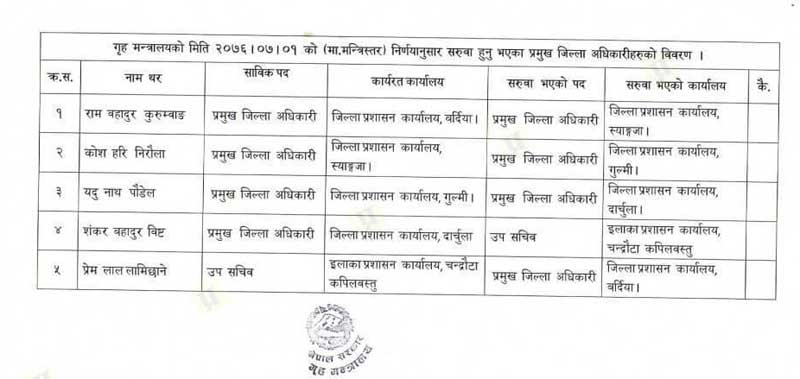 यदुनाथ पौडेललाई गुल्मीबाट दार्चुला, शंकरबहादुर विष्टलाई दार्चुलाबाट ईलाका प्रशासन कार्यालय चन्द्रौटा, कपिलवस्तु र प्रेमलाल लामिछानेलाई चन्द्रौटाबाट बर्दिया सुरुवा गरिएको विज्ञप्तिमा उल्लेख छ ।