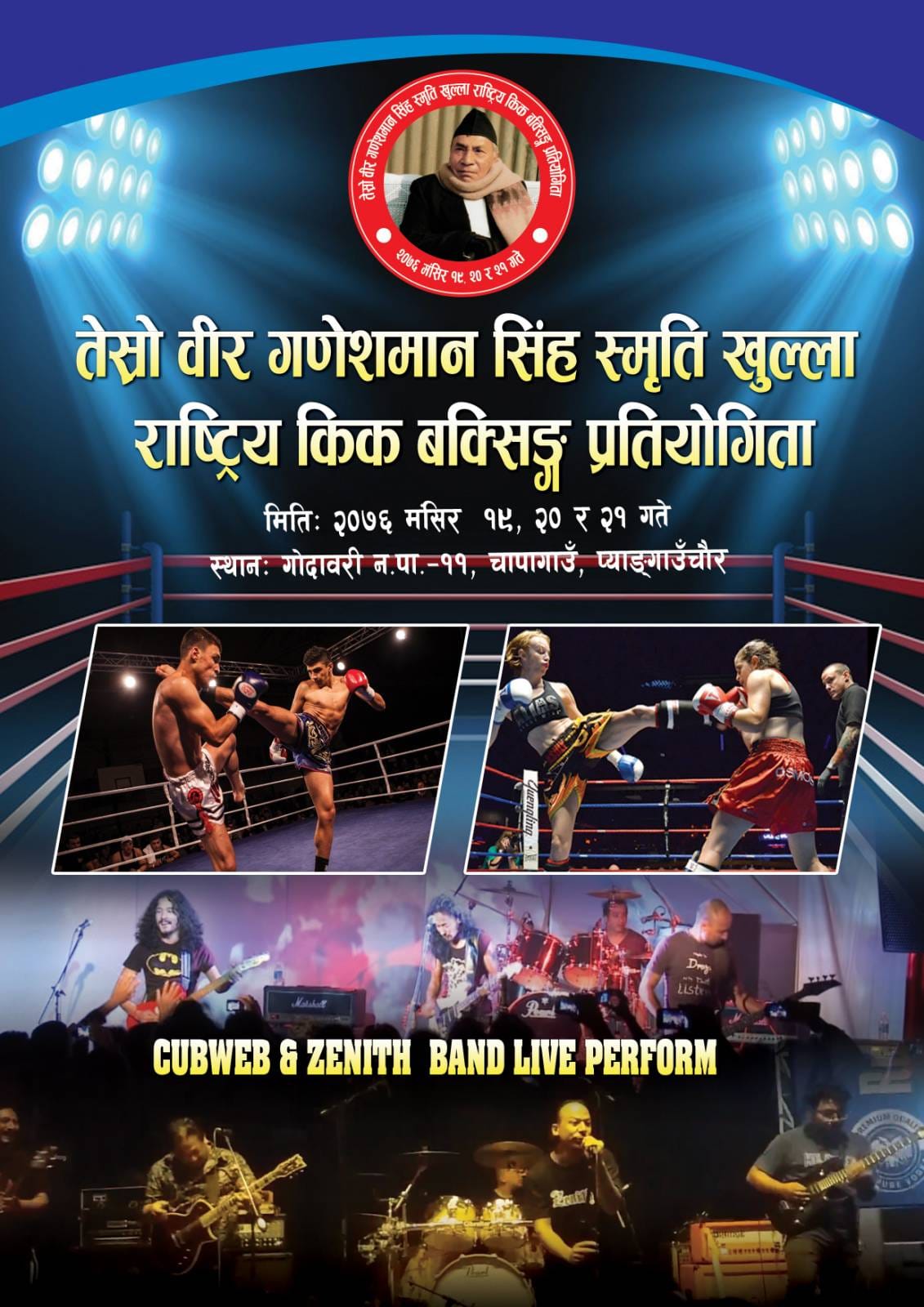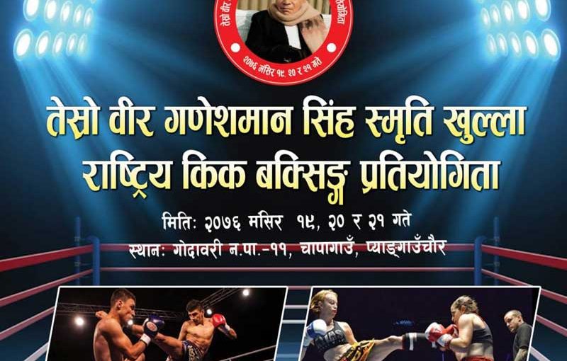 ललितपुर । ललितपुर जिल्लाकाे गोदावरी नगरपालिका चापागाउँको प्याङगाउँ चौरमा तेस्रो वीर गणेशमान सिंह स्मृति खुल्ला राष्ट्रिय किक बक्सिङ प्रतियोगिता हुने भएकाे छ ।