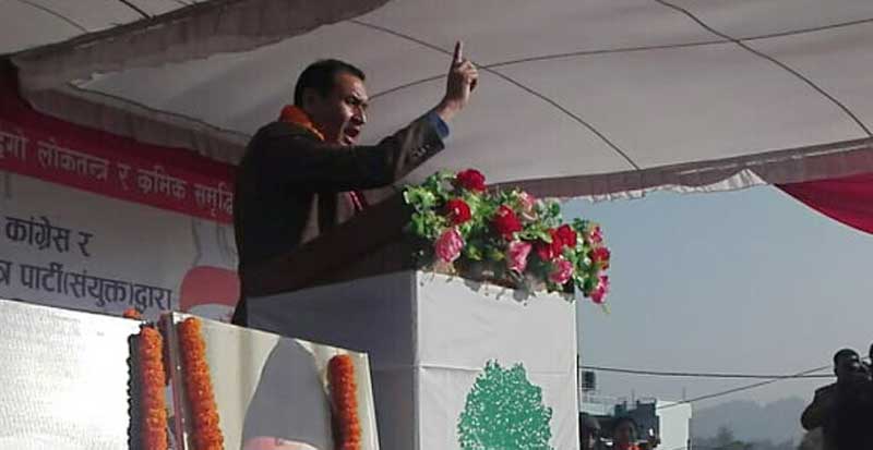 ‘नेपाली जनतालाई केपी ओलीले कर प्रसाद बनेर करको मारमा पार्नुभयो । करबाट मुक्ति दिनपनि नेपाली कांग्रेसलाई जिताउनुपर्छ’, उनले भने, ‘आज दुईतिहाइको सरकार छ । सरकारले जनतालाई राहत दिने बेलामा कञ्चनपुरकी एउटा महिला दुई वर्षदेखि हत्या हुँदा पनि प्रधानमन्त्री र नजिकका मान्छे गृहमन्त्री कहिल्यै त्यसको खोजी गर्न लागेनन् । हामीलाई आशंका छ । त्यही आशंकालाई मेट्नका लागि पनि तिनै चेलीका आमाबुबालाई न्याय दिलाउनका लागि सरकारको विरुद्धको उम्मेदवारलाई जिताउनुपर्छ ।’