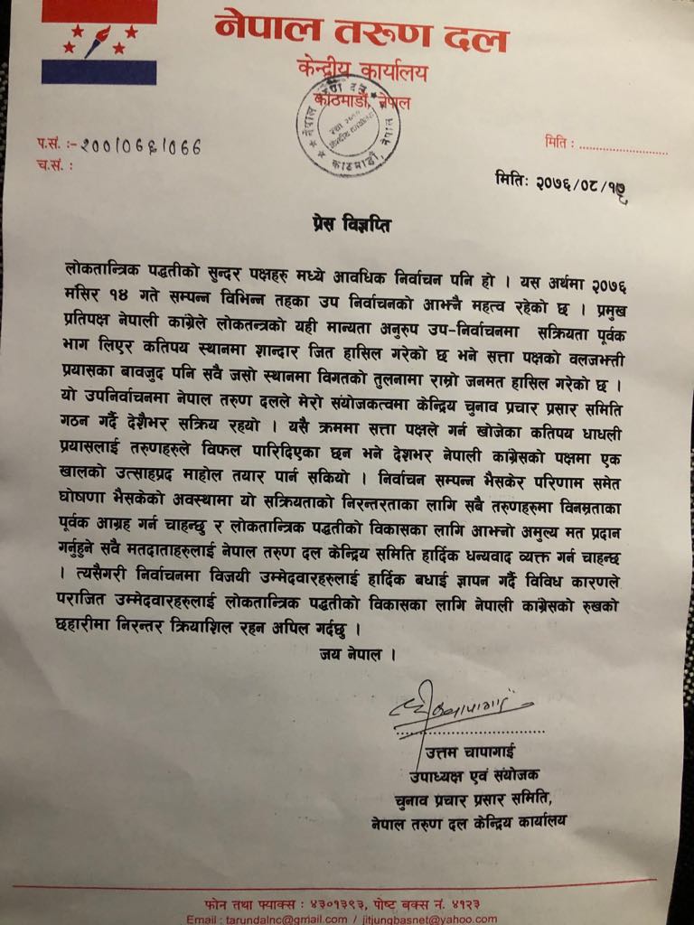 ‘सत्ता पक्षको बलजफ्ती प्रयासका बाबजुद पनि सबै जसो स्थानमा विगतको तुलनामा राम्रो जनमत हासिल गरेको छ’, विज्ञप्तिमा भनिएको छ, ‘यो उपनिर्वाचनमा नेपाल तरुण दलले मेरो संयोजकत्वमा केन्द्रीय चुनाव प्रचार प्रसार समिति गठन गर्दै देशभरि सक्रिय रह्यो ।’