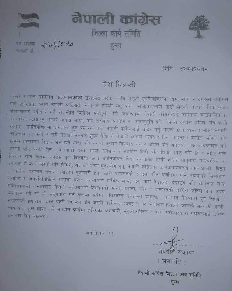 नेपाली कांग्रेस हुम्लाले विज्ञप्ति जारी गरेर मतदानमा सहभागी सबैलाई धन्याावद दिएको छ ।