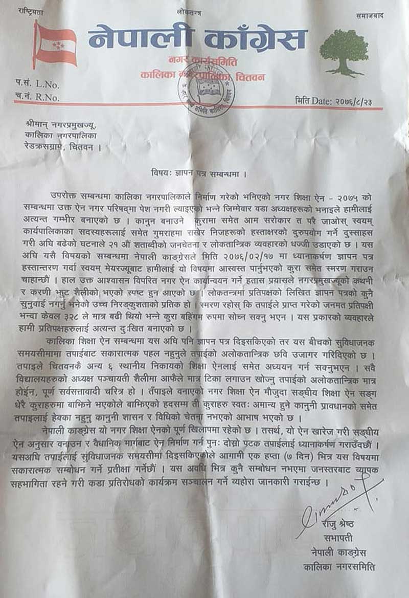 नगर शिक्षा ऐन खारेजीको माग गरेर नेपाली कांग्रेस कालिका नगर समितले सोमबार मेयर श्रेष्ठलाई ज्ञापन पत्र बुझाएको छ । नेपाली कांग्रेसले कानूनी शासन र विधिको शासन उल्लंघन नगर्न चेतनी दिएको छ ।