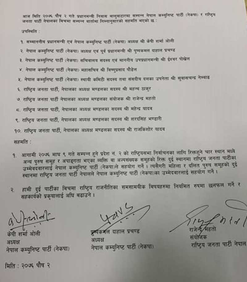‘आगामी माघ ९ गते सम्पन्न हुने प्रदेश २ को राष्ट्रिय सभा निर्वाचका लागि रिक्त हुने चार स्थानमध्ये अन्य पुरुष समूह र अपाङ्गता भएका व्यक्ति वा अल्पसंख्यक समूहको रिक्त दुई स्थानमा राष्ट्रिय जनता पार्टीका उम्मेदवारलाई नेपाल कम्युनिस्ट पार्टी (नेकपा)ले सहयोग गर्ने’, सहमतिको पहिलो बुँदामा भनिएको छ,