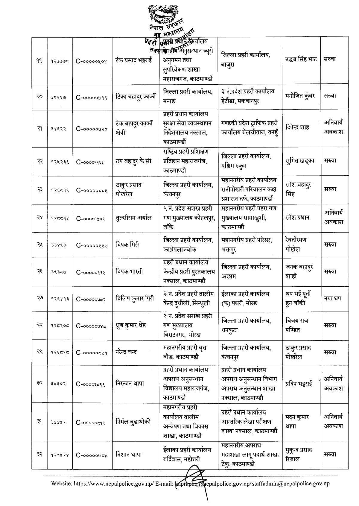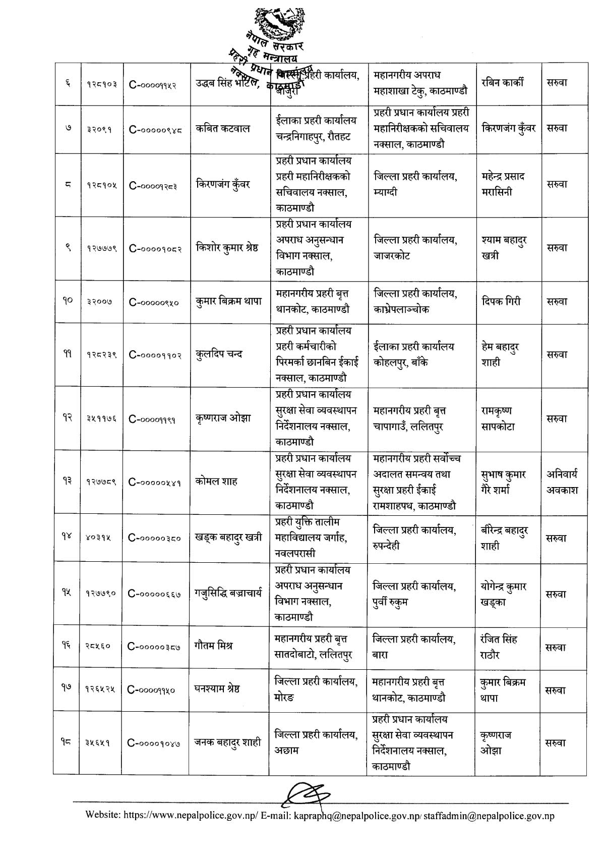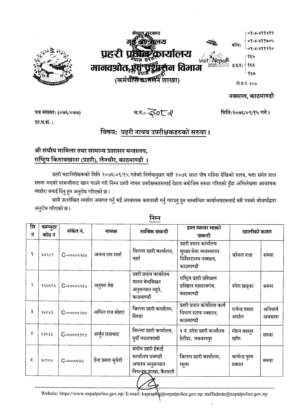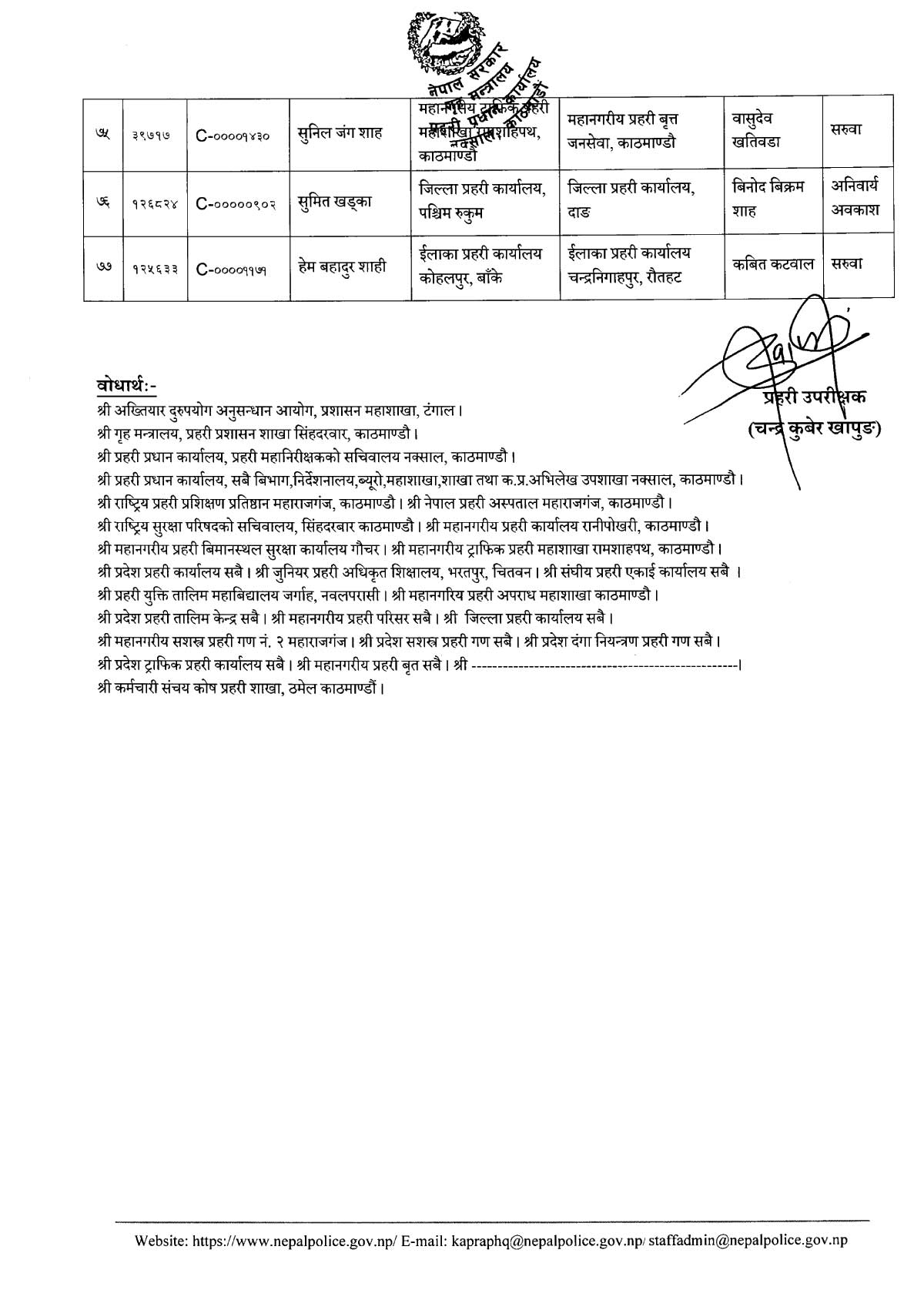सरुवा हुने डीएसपीमा अनन्तराम शर्मा, अनुपम श्रेष्ठ, अपीलराज बोहरा, अर्जुन रानाभाट, ईन्द्रप्रसाद सुवेदी, उद्धवसिंह भटि, कविता कटवाल, सन्तोषकुमार भट्टराई कुलदीप चन्दलगायत रहेका छन् ।