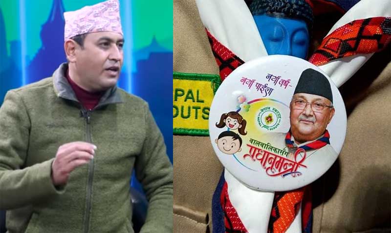 ‘भिजिट नेपाल शुरु गर्दापनि ओलीको तस्वीर उपहार दिने, नयाँ युग भनेर ओलीको तस्वीर सडकमा झुण्ड्याउने’, उनले भने, ‘हुँदाहुँदा ओलीजीको तस्वीर बालबालिकाको कार्यक्रममा पनि झुण्ड्याउने काम हुन थालेछ ।’