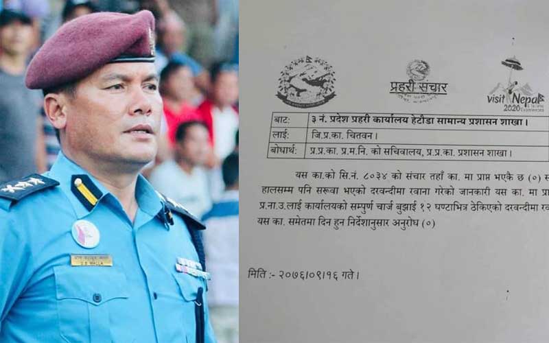 काठमाडौं । सरुवा हुँदा पनि जिल्ला प्रहरी कार्यालय चितवनमा जरो गाडेर बसेका एसपी दानबहादुर मल्ललाई १२ घण्टे पत्र थमाइएको छ ।