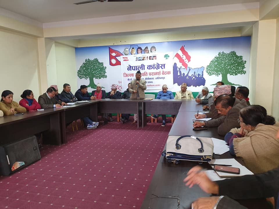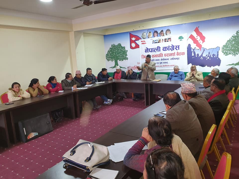 ललितपुरको सानेपास्थित नेपाली कांग्रेसको पार्टी मुख्यालयमा सोमबार बसेको पौडेल समूहका जिल्ला सभापतिहरूको परामर्श बैठकमा धारणा राख्ने जिल्ला सभापतिहरूले पार्टीका शीर्ष नेतृत्व मिल्नुपर्ने धारणा राखेको नेपाली कांग्रेस चितवनका सभापति जितनारायण श्रेष्ठले जानकारी दिए ।