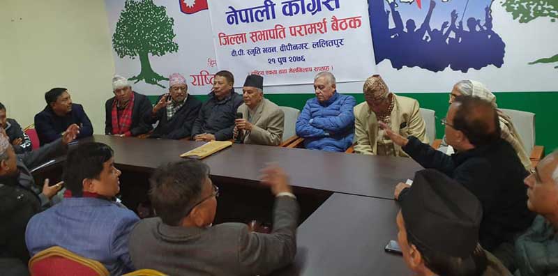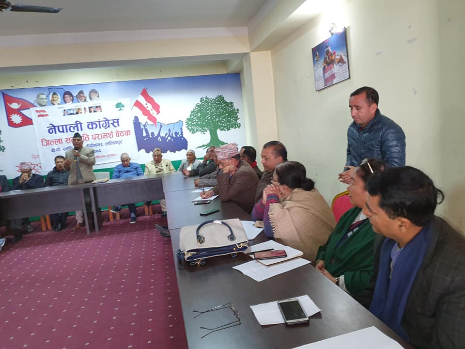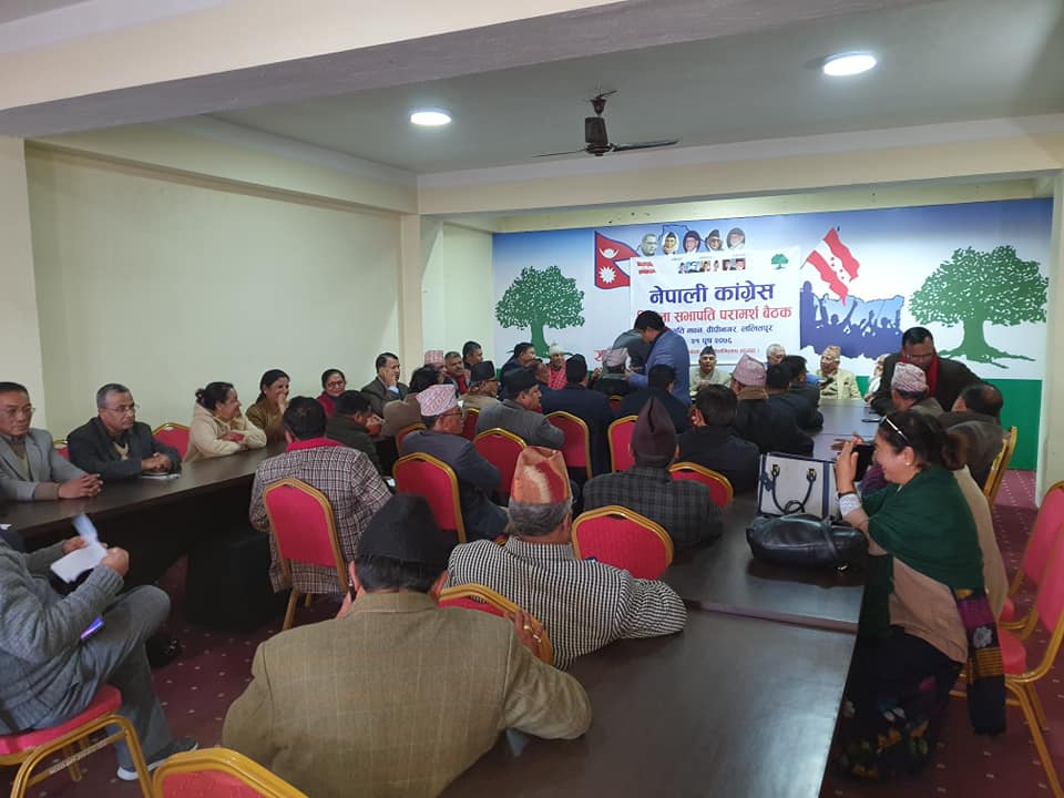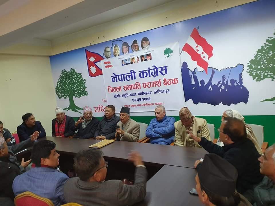 ललितपुरको सानेपास्थित नेपाली कांग्रेसको पार्टी मुख्यालयमा सोमबार बसेको पौडेल समूहका जिल्ला सभापतिहरूको परामर्श बैठकमा धारणा राख्ने जिल्ला सभापतिहरूले पार्टीका शीर्ष नेतृत्व मिल्नुपर्ने धारणा राखेको नेपाली कांग्रेस चितवनका सभापति जितनारायण श्रेष्ठले जानकारी दिए ।