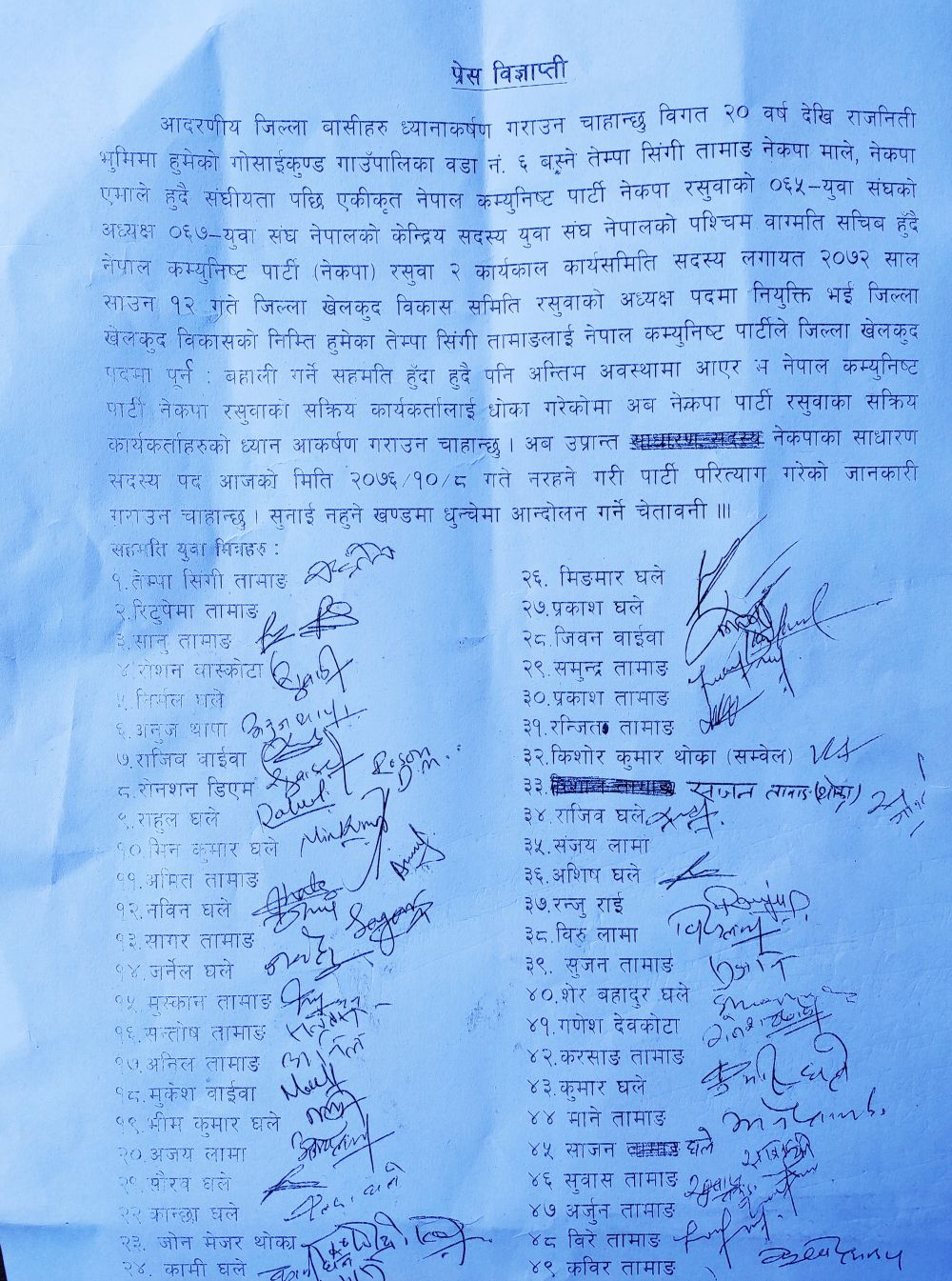 नेकपामा आबद्ध जिल्ला खेलकुद विकास समिति रसुवाका पूर्वअध्यक्ष तेम्पासिंगी तामाङ सहित ५० जनाले पार्टी परित्याग गरेको विज्ञप्तिमा उल्लेख छ ।