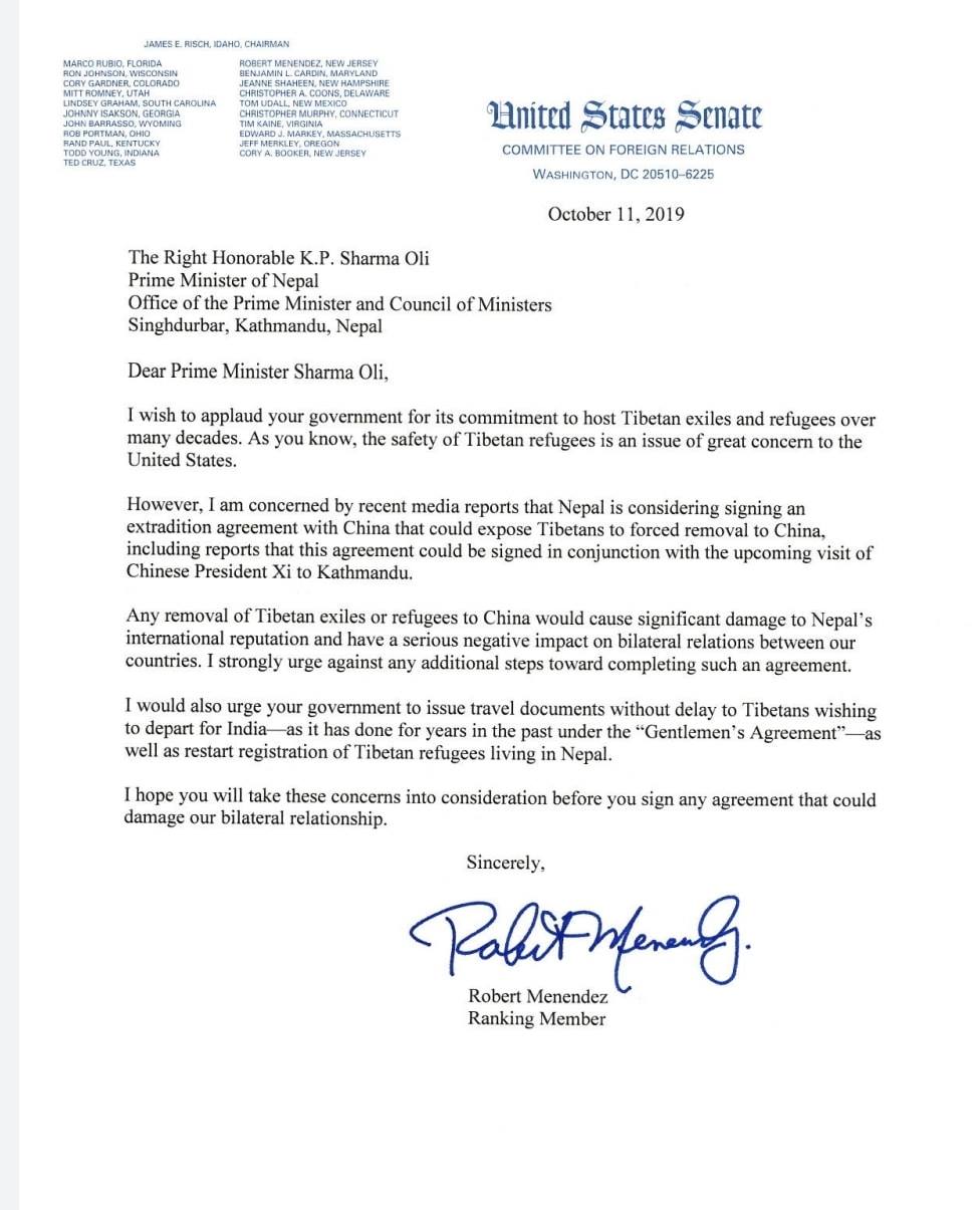 अमेरिकी सिनेटर एवं वैदेशिक मामिला समिति सदस्य रबर्ट मेनेनडेजले असोज २४ गते चिनियाँ राष्ट्रपतिको आसन्न नेपाल भ्रमणमा चीनसँग सुपुर्दगी सन्धि गर्न नेपाल तत्पर रहेको र यसबाट नेपालमा रहेका तिब्बती शरणार्थी हटाउने प्रक्रिया अघि बढ्न सक्ने भनी पत्रै लेखेर ध्यानाकर्षण गराएका थिए ।