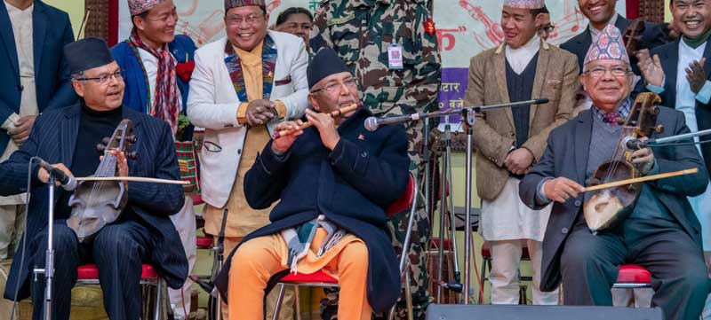 बालुवाटारस्थित आफ्नै सरकारी निवासमा ओलीले सारंगी, बासुरी बजाएर रमाइलो गरेका छन् ।