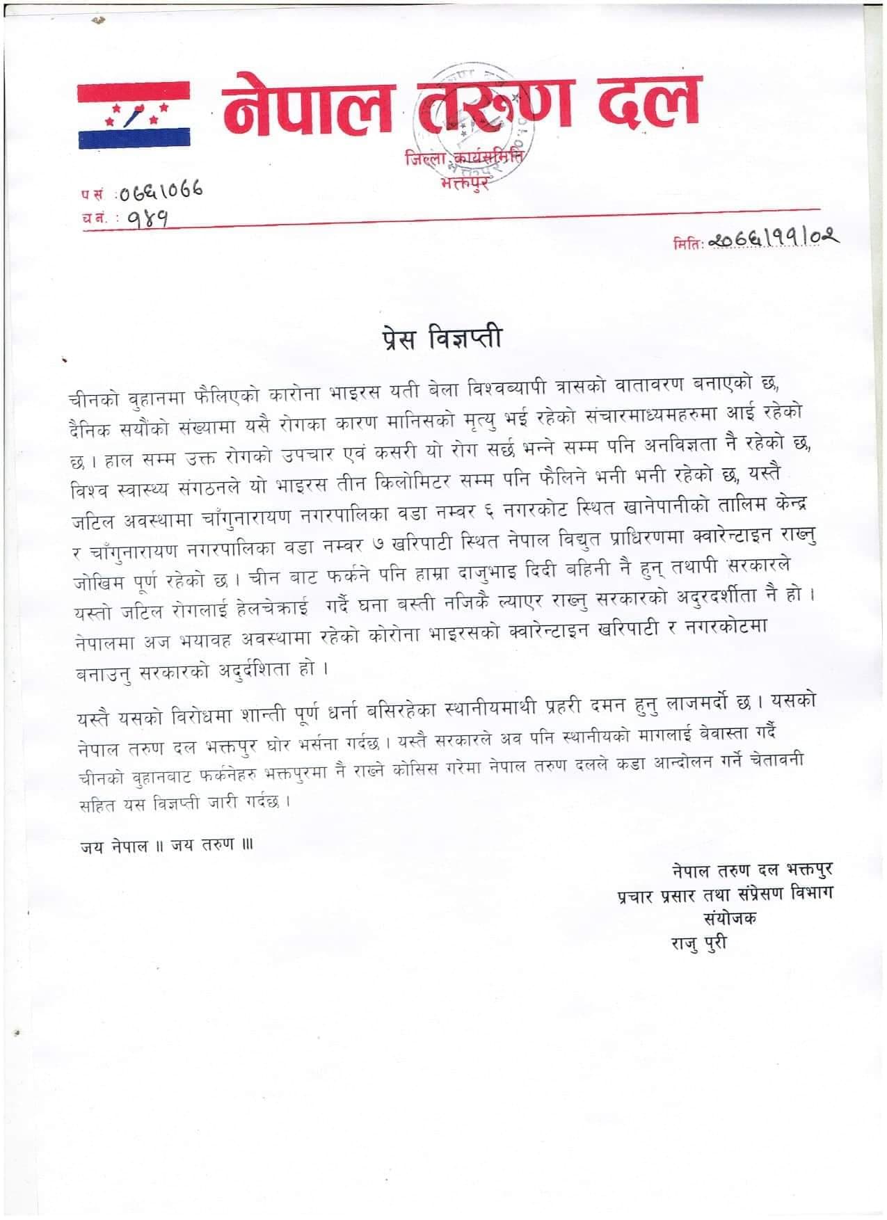 नेपाल तरुण दल भक्तपुर प्रचार प्रसास तथा सम्प्रेषण विभागका संयोजक राजु पुरीले शुक्रबार विज्ञप्ति जारी गरेर खरिपाटी र नगरकोटलाई क्वारेन्टाइन नबनाउन आग्रह गरेका हुन् ।