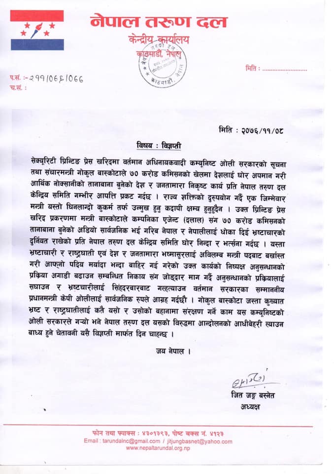 ‘सेक्युरिटी प्रिन्टिङ प्रेस खरिदमा वर्तमान अधिनायकवादी कम्युनिस्ट ओली सरकारको सूचना तथा सञ्चार प्रविधिमन्त्री गोकुल बास्कोटाले ७० करोड कमिसनको खेलमा देशलाई घोर अपमान गरी आर्थिक नोक्सानीको तानाबाना बुनेको देश र जनतामारा निकृष्ट कार्यप्रति नेपाल तरुण दल केन्द्रीय कार्यसमिति गम्भीर आपत्ति प्रकट गर्दछ’, अध्यक्ष बस्नेतद्वारा जारी विज्ञप्तिमा उल्लेख छ ।
