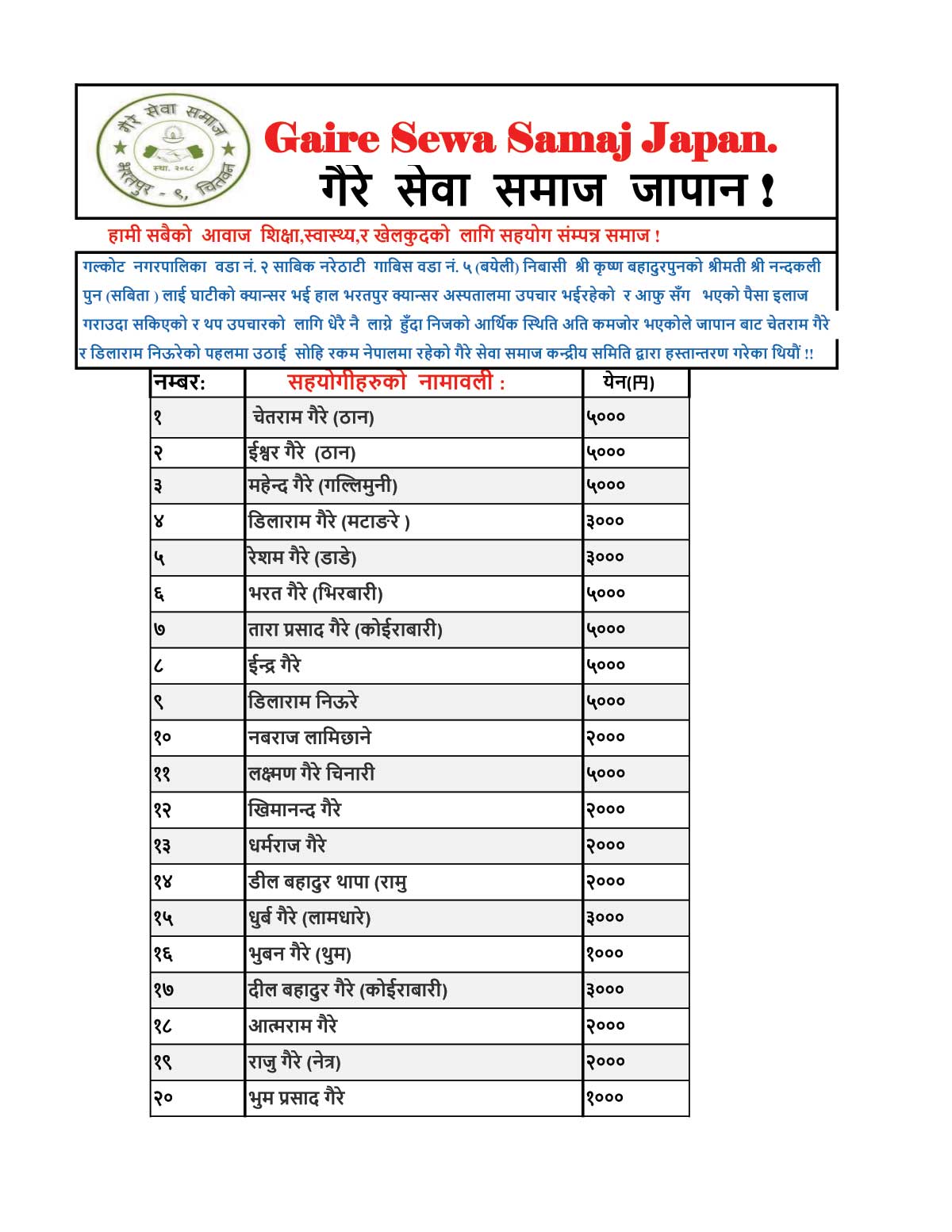 आर्थिक सहयोगका लागि गैरे सेवा समाज जापानबाट चेतराम गैरेको विशेष पहलमा सहयोग रकम संकलन गरिएको सचिव कुलप्रसाद गैरेले बताए ।