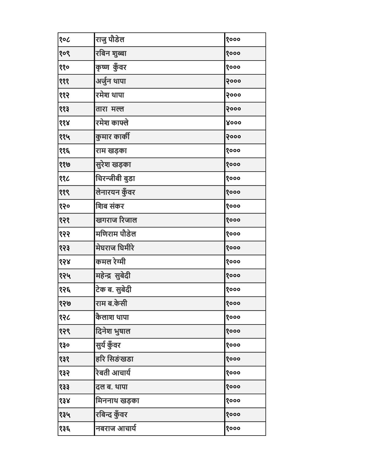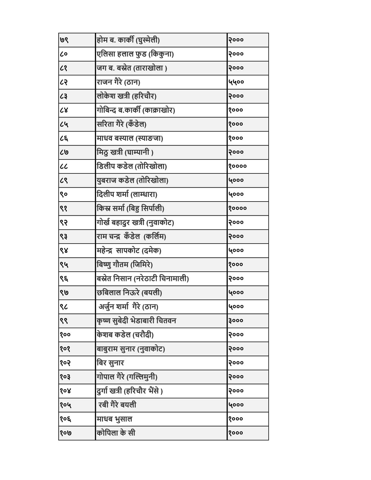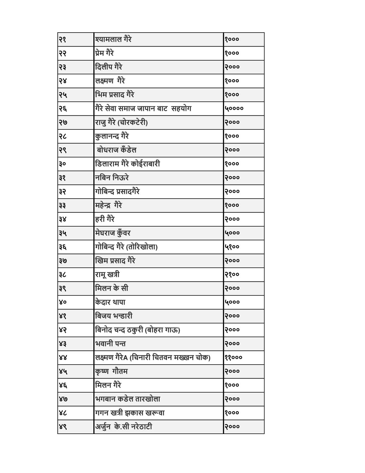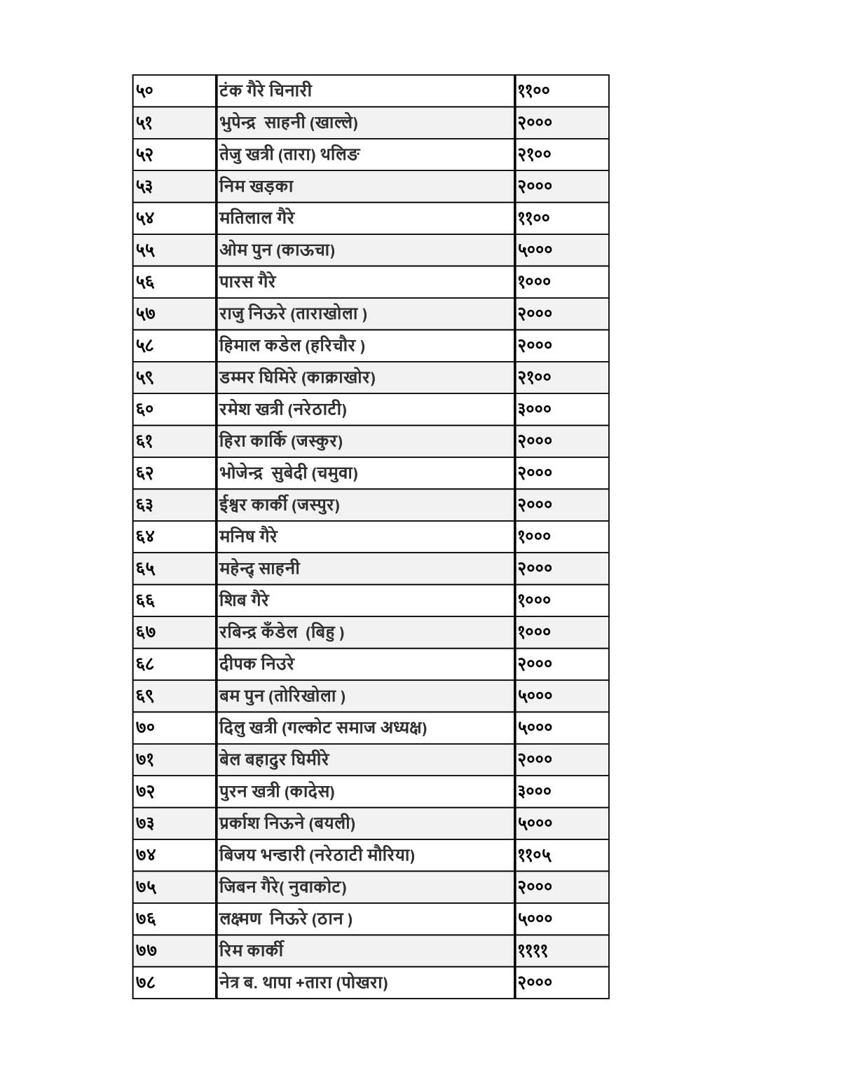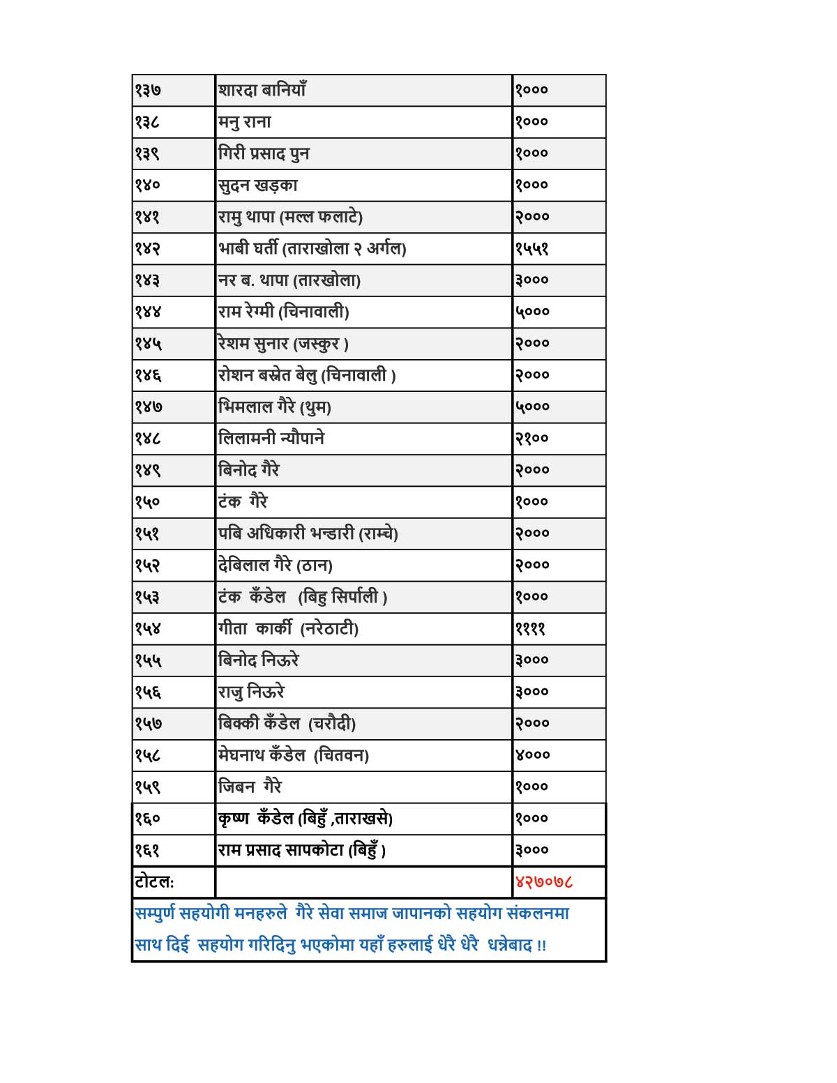 हङकङबाट ५ लाख ५१ हजार, अमेरिकाबाट ५१ हजार १ सय ४३, जापानबाट ४ लाख ४२ हजार कोरियाबाट ५० हजार फ्रान्सबाट २० हजार, नगर स्वास्थ्य केन्द्रबाट १ लाख र स्थानीय तथा नेपालबाट ३ लाख ७९ हजार ७५ रुपिया संकलन भैसकेको छ ।