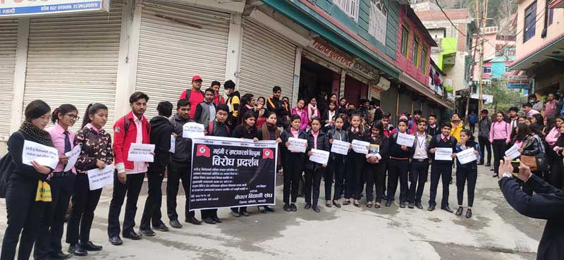 म्याग्दी क्याम्पसको प्रवेशद्वार, क्याम्पस चोकमा भ्रष्टाचार, महँङ्गी, पुस्तक आयातमा कर बृद्धि, मूल्यबृद्धि, ईन्धनमा बढाएको पूर्वाधार कर बृद्धि लगायतको बिरोधमा नेविसंघले प्रदर्शन गरेको जनाइएको छ ।