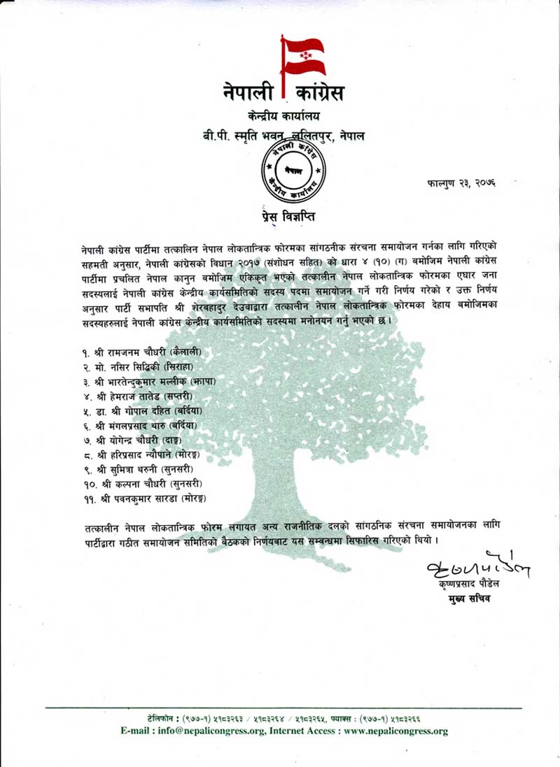 ‘नेपाली कांग्रेस पार्टीमा तत्कालीन नेपाल लोकतान्त्रिक फोरमका सांगठनिक संरचना समायोजन गर्नका लागि गरिएको सहमति अनुसार, नेपाली कांग्रेसको विधान २०१७ (संशोधन सहित) को धारा ४ (१०) (ग) बमोजिम नेपाली कांग्रेस पार्टीमा प्रचलित नेपाल कानून बमोजिम एकीकृत भएको तत्कालीन नेपाल लोकतान्त्रिक फोरमका एघार जना सदस्यलाई नेपाली कांग्रेस केन्द्रीय कार्यसमितिको सदस्य पदमा समायोजन गर्ने गरी निर्णय गरेको र उक्त निर्णय अनुसार पार्टी सभापति श्री शेरबहादुर देउवाद्वारा तत्कालीन नेपाल लोकतान्त्रिक फोरमका देहाय बमोजिमका सदस्यहरुलाई नेपाली कांग्रेस केन्द्रीय कार्यसमितिको सदस्यमा मनोनयन गर्नु भएको छ’, विज्ञप्तिमा भनिएको छ ।