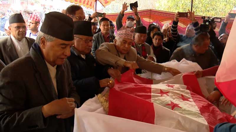देउवा–पौडेलले ओढाए चारतारे झण्डा, नेताहरूले दिए श्रद्धाञ्जलि