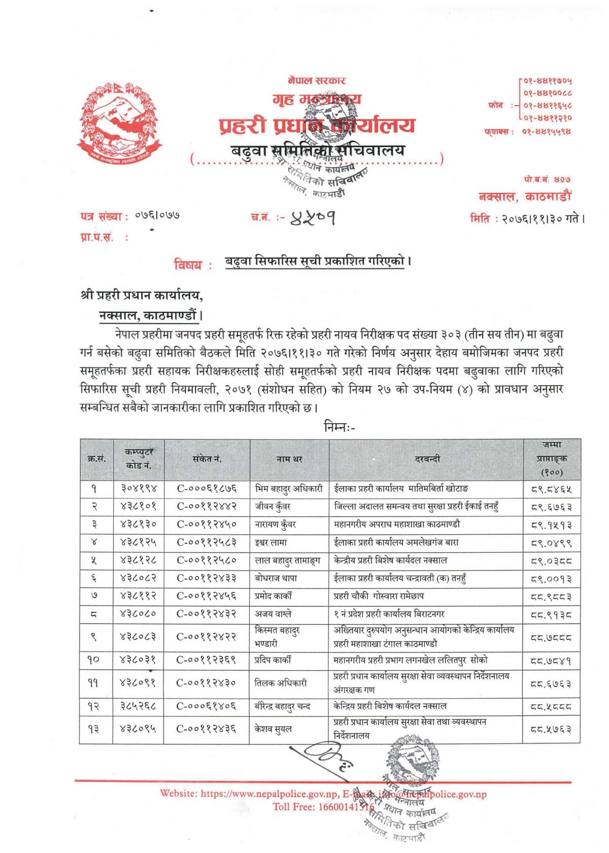 जनपद प्रहरी समूहतर्फ रिक्त रहेको प्रहरी नायव निरीक्षकहरूमा बढुवा गरिएको विज्ञप्तिमा उल्लेख छ ।
