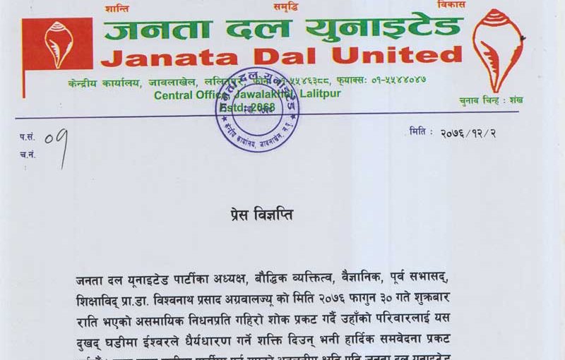 काठमाडौं । जनता दल यूनाइटेडका उपाध्यक्ष किरण मगरले पार्टीका अध्यक्ष एवम् पूर्वसांसद प्रा.डा.विश्वनाथप्रसाद अग्रवालको निधन भएकोमा शोकट प्रकट गरेका छन् ।