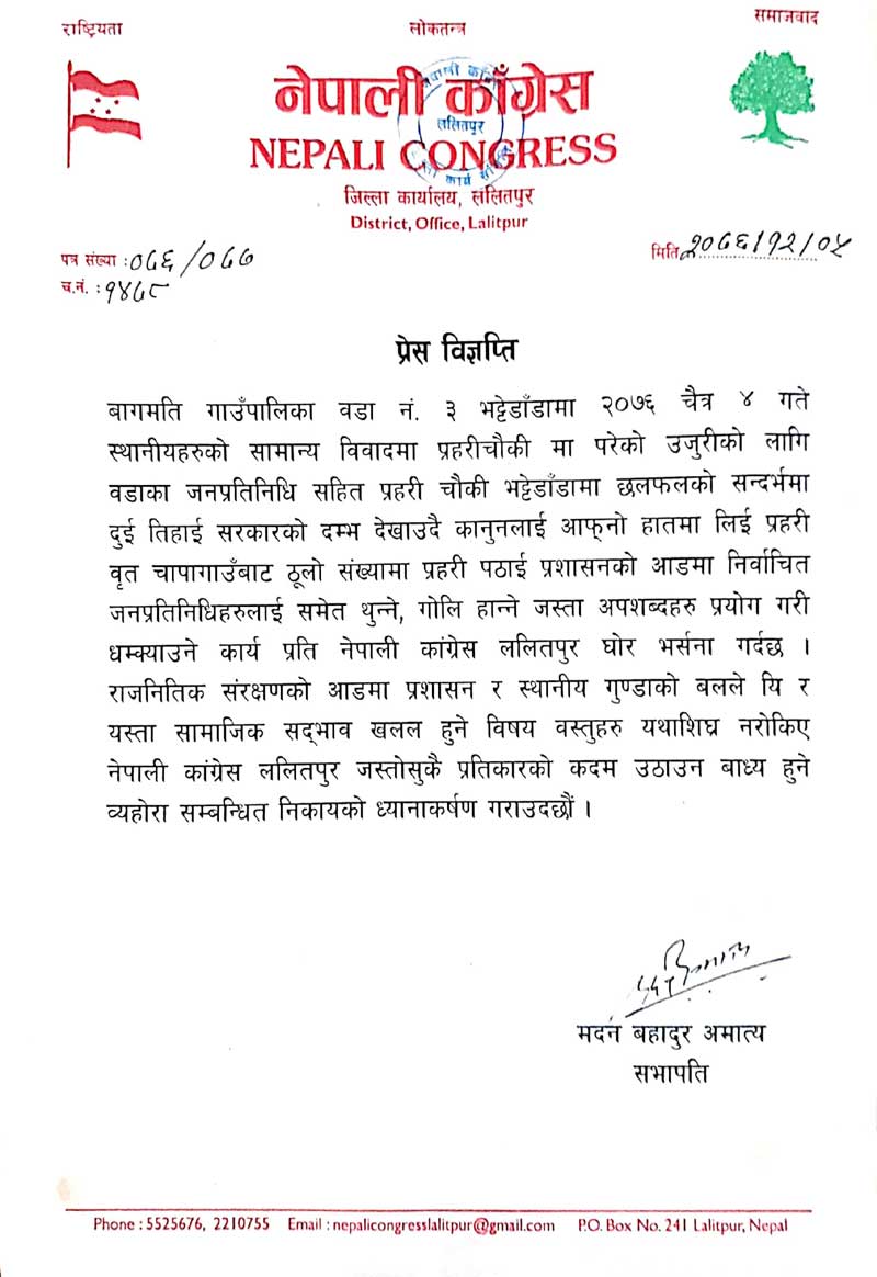 ‘बागमती गाउँपालिका नम्बर ३ भट्टडाँडामा ०७६ चैत ४ गते स्थानीयहरूको सामान्य विवादमा प्रहरी चौकीमा परेको उजुरीको लागि वडाका जनप्रतिनिधिसहित प्रहरी चौकी भट्टेडाँडामा छलफलको सन्दर्भमा दुईतिहाइ सरकारको दम्भ देखाउँदै कानूनलाई आफ्नो हातमा लिइ प्रहरी वृत्त चापगाउँबाट ठूलो संख्यामा प्रहरी पठाइ प्रशानको आडमा निर्वाचित जनप्रतिनिधिहरूलाई समेत थुन्ने, गोली हान्ने जस्तो अपशब्दहरू प्रयोग गरी धम्काउने कार्यप्रति नेपाली कांग्रेस ललितपुर घोर भर्त्सना गर्दछ’, विज्ञप्तिमा भनिएको छ ।