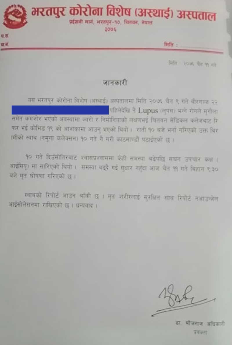 भरतपुर कोरोना अस्पतालमा निधन भएका युवकबारे प्रवक्ताले जारी गरे तथ्य