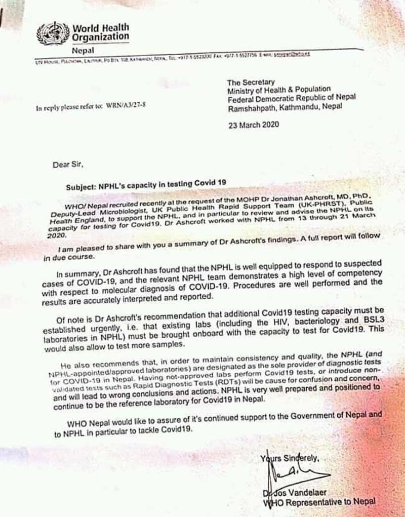 डब्ल्यूएचओका नेपाल प्रतिनिधि डा.जोस भेन्डिलिएरद्वारा जारी पत्रमा नेपालको केन्द्रीय जनस्वास्थ्य प्रयोगशालाले गरेको कोरोना भाइरसको परीक्षण विश्वसनीय र चित्तबुझ्दो रहेको उल्लेख छ ।