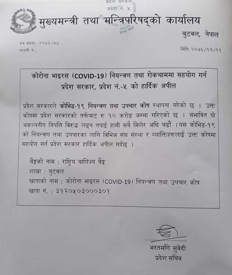प्रदेश ५ को सरकारले राष्ट्रिय वाणिज्य बैंक बुटवल शाखामा रहेको ‘कोरोना भाइरस नियन्त्रण तथा उपचार कोष’को नामको खाता नम्बर ३१२०५०३०००३०१ मा सहयोग गर्न अपील गरेको छ ।
