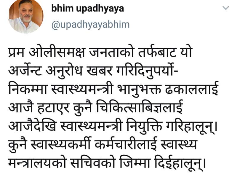 ‘प्रधानमन्त्री खड्गप्रसाद ओलीसमक्ष जनताको तर्फबाट यो अर्जेन्ट अनुरोध खबर गरिदिनुप¥यो’, ट्वीटमा उपाध्यायले भनेका छन्, ‘निकम्मा स्वास्थ्यमन्त्री भानुभक्त ढकाललाई आजै हटाएर कुनै चिकित्साविज्ञलाई आजैदेखि स्वास्थ्यमन्त्री नियुक्ति गरिहालुन् ।’
