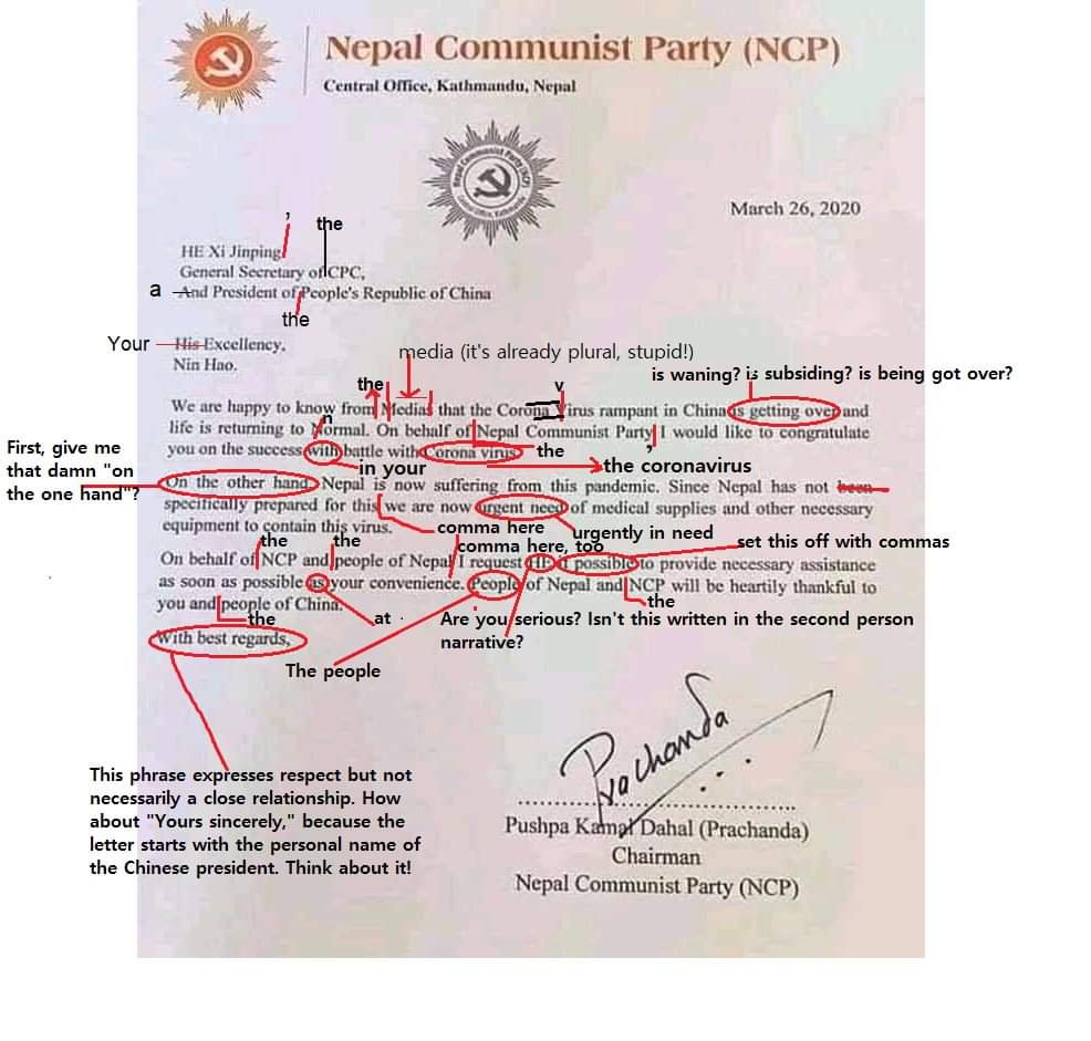 नेकपाका दोस्रो तहका अध्यक्ष दाहालले चिनियाँ राष्ट्रपतिलाई अंग्रेजी भाषामा लेखेर पठाएका थिए । त्यो पत्रमा एक दर्जनभन्दा धेरै ठाउँमा ब्याकरण मिलेको थिएन । ब्याकरण नमिलेको दाहालको त्यो पत्र सामाजिक सञ्जालमा भाइरल बनेको छ ।