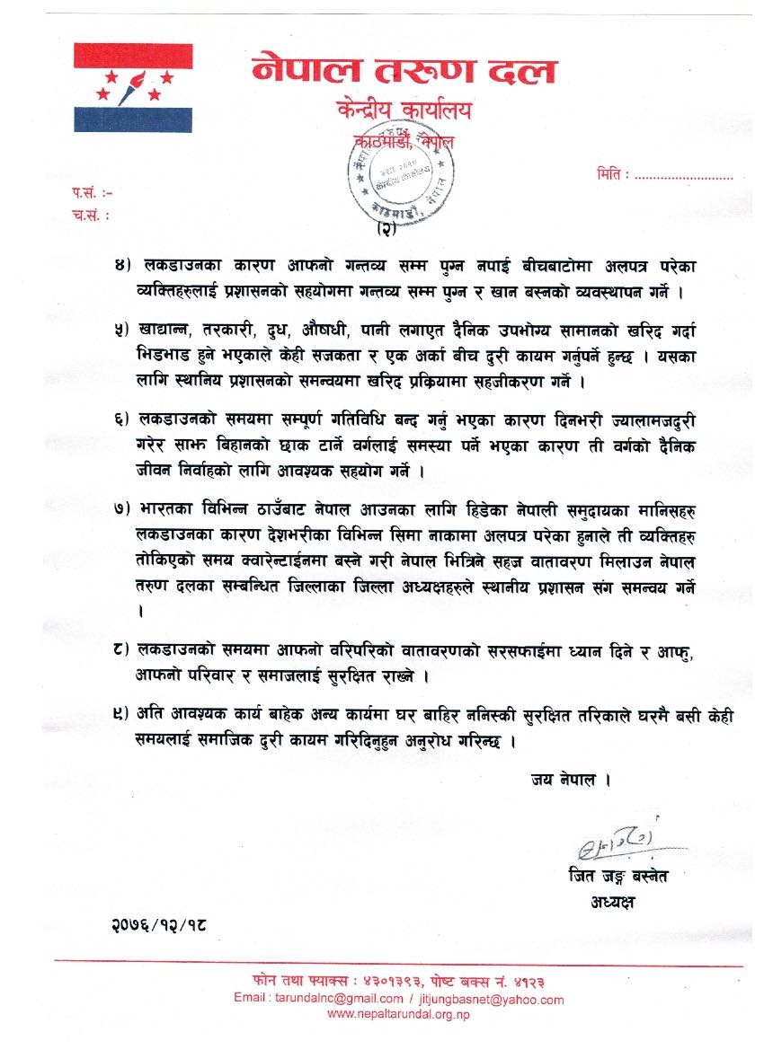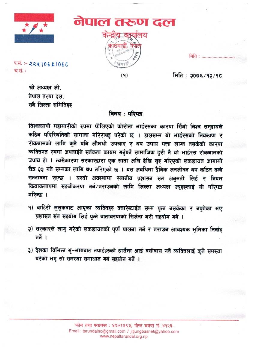 ‘लकडाउनको समयमा आफ्नो वरिपरिको वातावरणको सरसफाईमा ध्यान दिने र आफू, आफ्नो परिवार र समाजलाई सुरक्षित राख्ने’, तरुण दलको परिपत्रमा भनिएको छ, ‘अति आवश्यक कार्य बाहेक अन्य कार्यमा घर बाहिर ननिस्की सुरक्षित तरिकाले घरमै बसी केही समयलाई समाजिक दुरी कायम गरिदिनुहुन अनुरोध गरिन्छ ।’