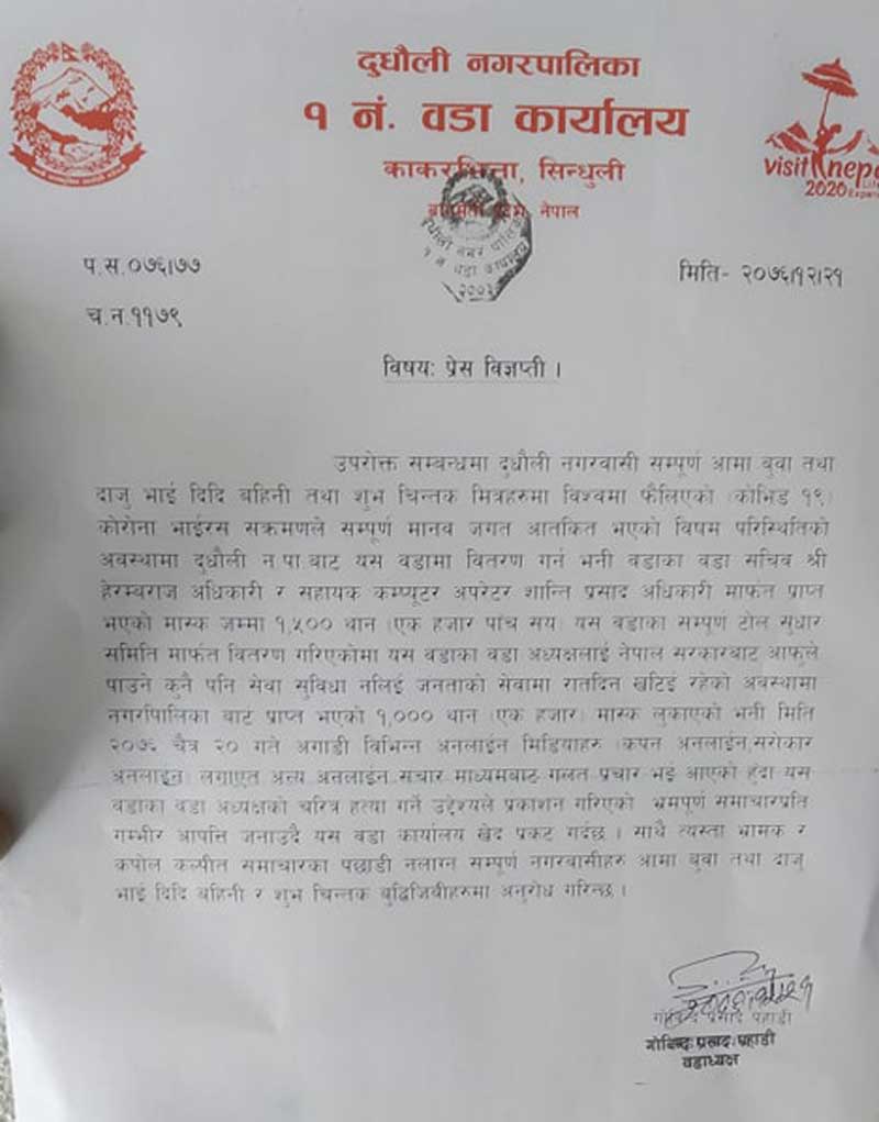 कोरोना भाइरसको संक्रमणका कारण पूरै देश लकडाउनमा छ । दुधौली नगरपालिकाका मेयर एवम् नेकपाका नेता घनश्याम रावतले नगरपालिकाको पैसाले मास्कहरू खरिद गरे । मेयर रावतसँग वडा नम्बर १ का वडाध्यक्ष एवम् नेपाली कांग्रेसका नेता गोविन्द पहाडीले मास्क माग गरे । मेयर रावतले २५ सय मास्क पनि पठाइदिए ।