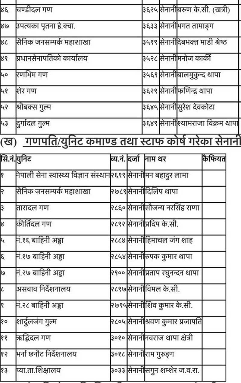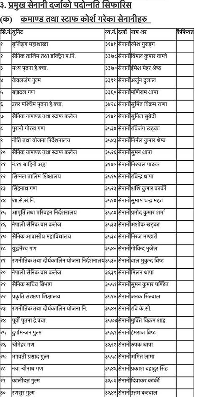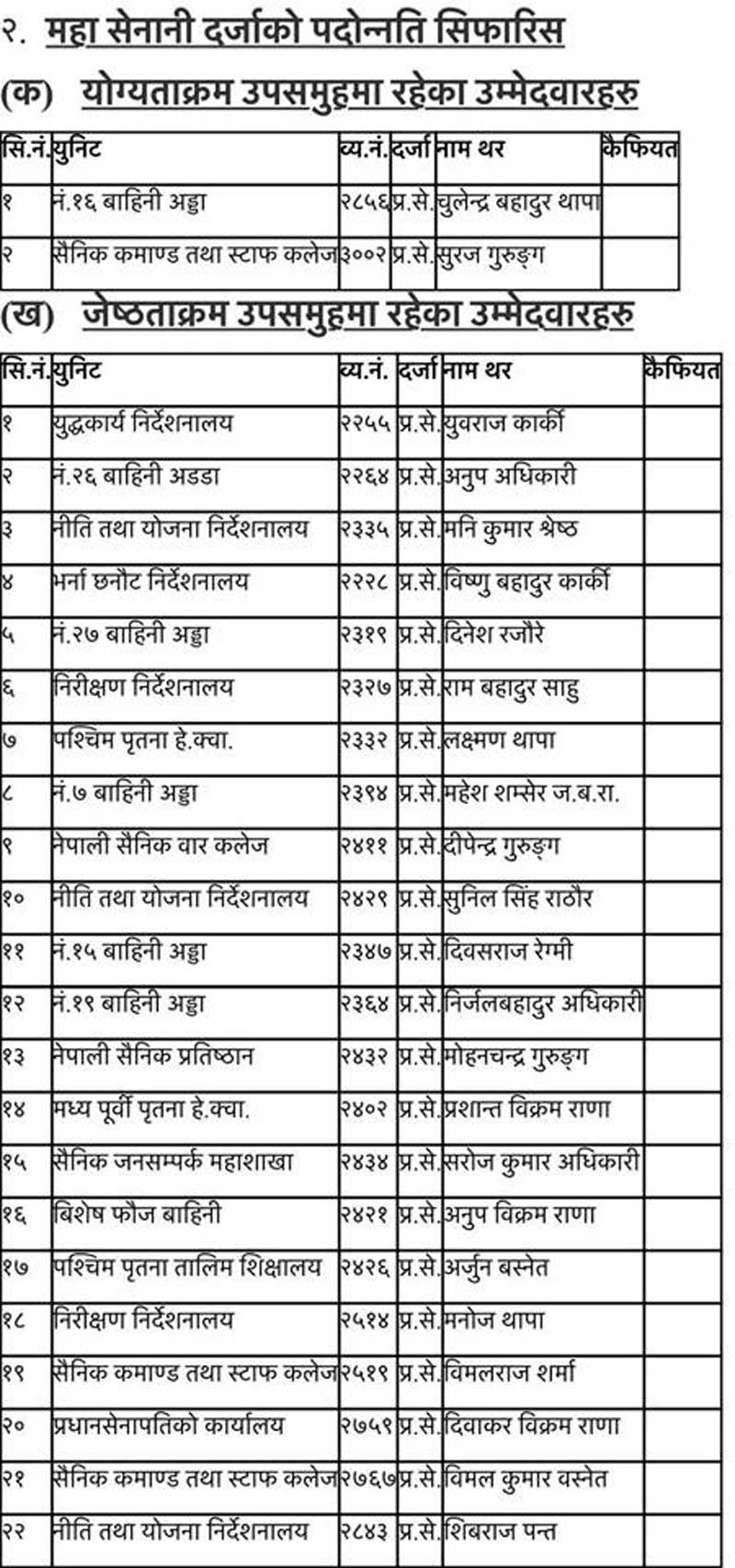 महासेनानी र प्रमुख सेनानीमा बढुवा सिफारीस भएकाहरूलाई०७७ सालमा रिक्त हुन आउने पदअनुसार बढुवा गर्नेछ ।