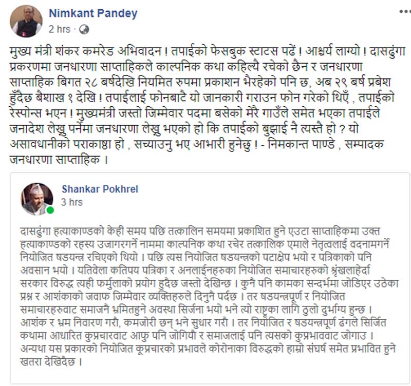सम्पादक पाण्डेले फेसबुकमा लेखेका छन्, ‘मुख्यमन्त्री शंकर कमरेड अभिवादन ! तपाईको फेसबुक स्टाटस पढें ! आश्चर्य लाग्यो ! दासढुंगा प्रकरणमा जनधारणा साप्ताहिकले काल्पनिक कथा कहिल्यै रचेको छैन र जनधारणा साप्ताहिक बिगत २८ वर्षदेखि नियमित रुपमा प्रकाशन भैरहेको पनि छ ।’