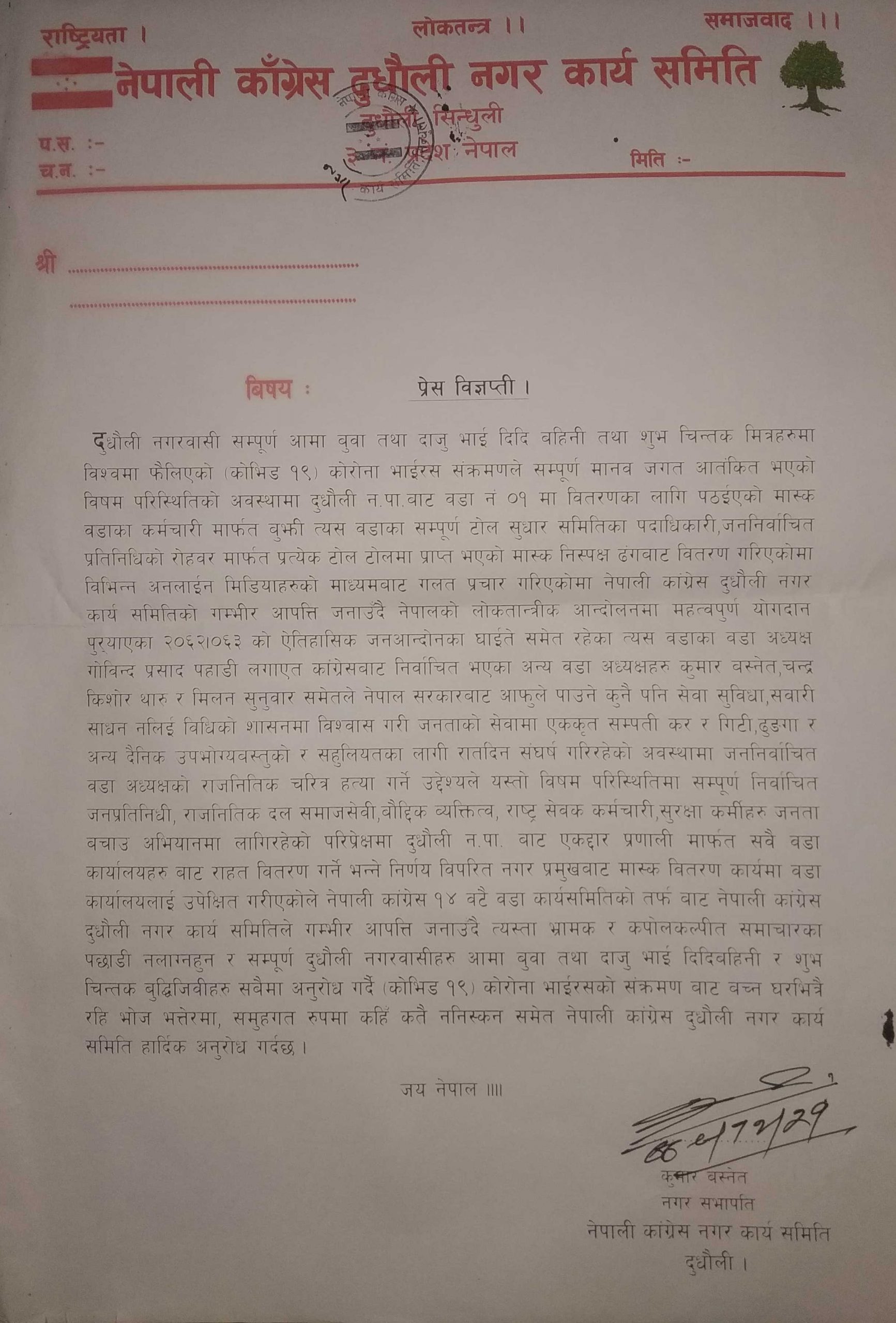 ‘कोरोना भाइरसको संक्रमणबाट जनता बचाउन मुलुक नै अभियानमा लागिरिरहेको परिपेक्ष दुधौली नगरपालिकाबाट एकद्वार प्रणालीमार्फत सबै वडा कार्यालयहरूबाट राहत वितरण गर्ने भन्ने निर्णय विपरित नगर प्रमुखबाट मास्क वितरण कार्यमा वडा कार्यालयलाई उपेक्षित गरिएकोले नेपाली कांग्रेस १४ वटै वडा कार्यसमितिको तर्फबाट नेपाली कांग्रेस नगर कार्यसमितिले गम्भीर आपत्ति जनाएको छ’, विज्ञप्तिमा भनिएको छ, ‘भ्रामक कपोल्कल्पित समाचारको पछाडि नलाग्न अपील गर्दछौँ ।’