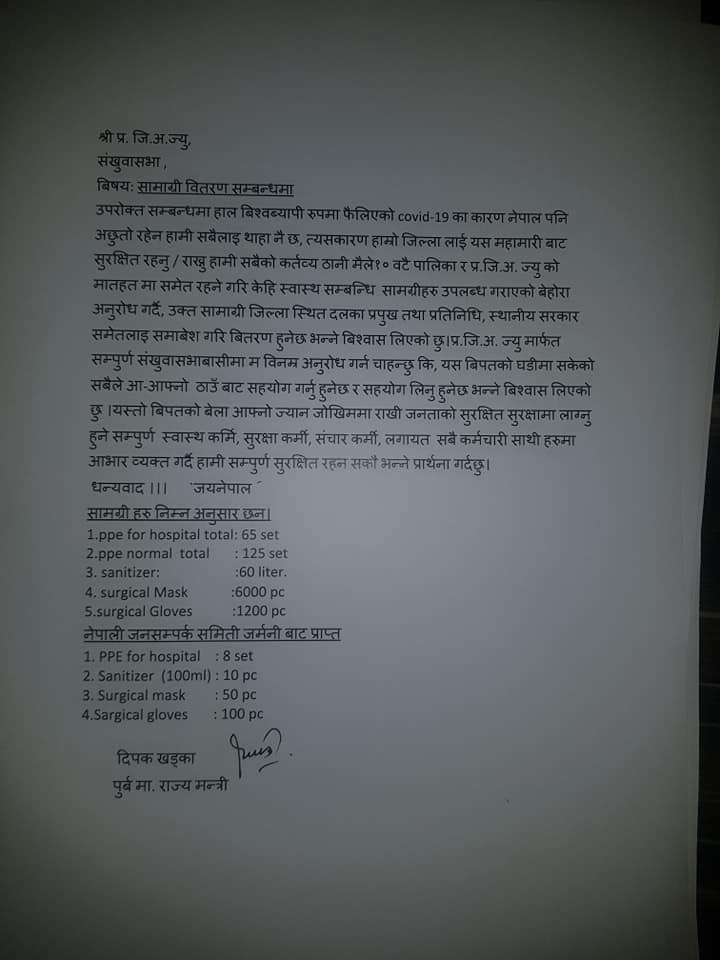 खड्काले हेलिकोप्टरमार्फत् १९८ थान पीपीई, ६० लिटर सेनीटाइजर, ६ हजार थान मास्क, १३ सय थान पञ्जा संखुवासभा लैजाने तयारी गरेका छन् ।