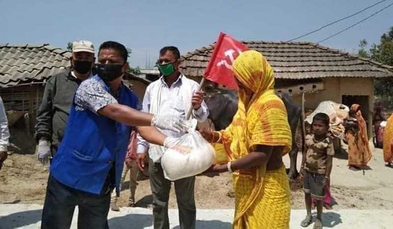राहत विरतणमा कांग्रेसलाई अबरोध, नेकपाद्वारा लाल झण्डा राखेर पाेकाे वितरण