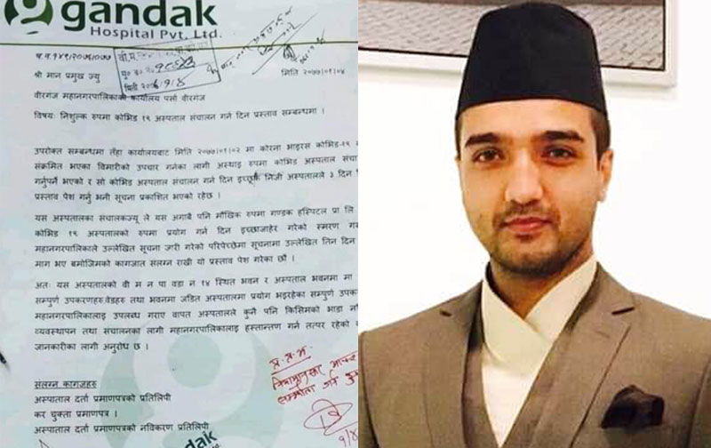 वीरगञ्ज । सत्तारुढ नेपाल कम्युनिस्ट पार्टी (नेकपा)का युवा नेता एवम् वीरगञ्ज महानगरपालिकाका नगर कमिटी अध्यक्ष रहबर अन्सारीले आफ्नो गण्डक अस्पताल सरकारलाई कोरोना भाइरसको संक्रमण भएका व्यक्तिहरूको उपचारका लागि निःशुल्क उपलब्ध गराएका छन् ।