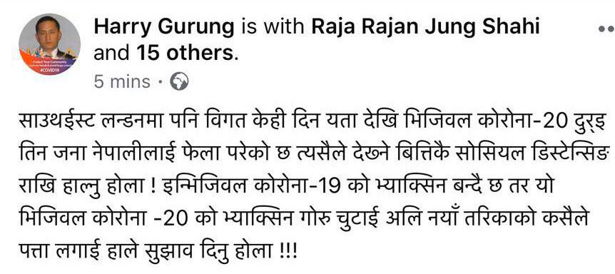 सदस्य गुरुङले एनआरएनए यूकेको राहत आफ्नै घरबाट बाँड्ने गरेको आरोप पनि लागेको छ । उनको विरोध भएपछि सदस्य गुरुङले आवेगमा आएर आफ्नो विरोधीहरूलाई कोभिड २० को संज्ञा दिएका छन् ।
