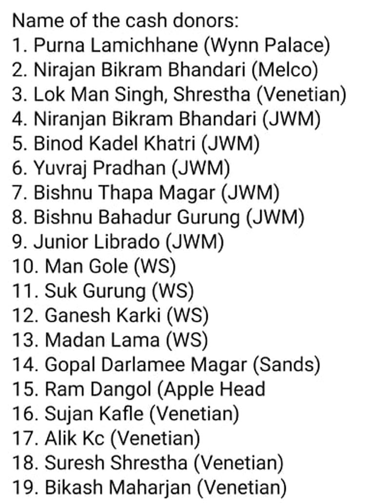 काठमाडौं । राष्ट्रिय खेलकुद परिषदका पूर्वकोषाध्यक्ष एवम् करातेका पूर्वअन्तर्राष्ट्रिय खेलाडी मीनकृष्ण महर्जनको अभियानमा साथ दिन मकाउमा रहेका नेपाली पूर्वखेलाडीहरूले आर्थिक सहयोग गरेका छन् ।