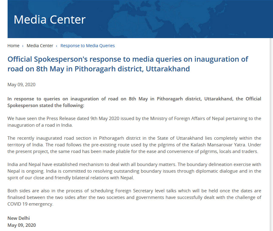 ‘उत्तराखण्ड राज्यको पिथौरागढ जिल्लामा भर्खरै उद्घाटन गरिएको सडक खण्ड पूर्ण रूपमा भारतको इलाकामा अवस्थित छ’, भारतले दाबी गरेको छ ।